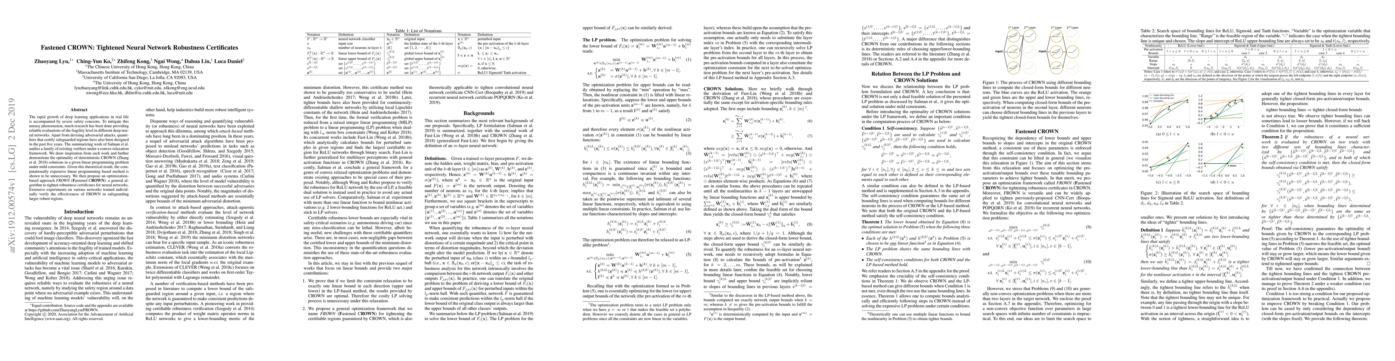 The rapid growth of deep learning applications in real life is accompanied by severe safety concerns. To mitigate this uneasy phenomenon, much research has been done providing reliable evaluations of the fragility level in different deep neural networks. Apart from devising adversarial attacks, quantifiers that certify safeguarded regions have also been designed in the past five years. The summarizing work of Salman et al. unifies a family of existing verifiers under a convex relaxation framework. We draw inspiration from such work and further demonstrate the optimality of deterministic CROWN (Zhang et al. 2018) solutions in a given linear programming problem under mild constraints. Given this theoretical result, the computationally expensive linear programming based method is shown to be unnecessary. We then propose an optimization-based approach \textit{FROWN} (\textbf{F}astened C\textbf{ROWN}): a general algorithm to tighten robustness certificates for neural networks. Extensive experiments on various networks trained individually verify the effectiveness of FROWN in safeguarding larger robust regions.