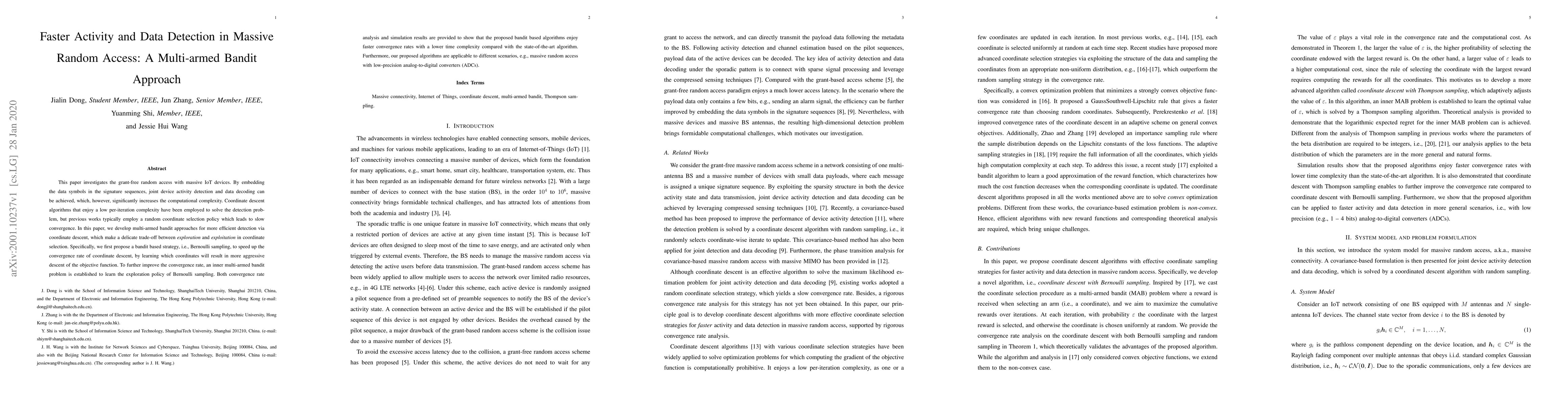 This paper proposes multi-armed bandit approaches to enhance the detection and data decoding in grant-free random access for massive IoT devices, achieving faster convergence rates via a refined coordinate descent strategy that balances exploration and exploitation. Simulation results show improved convergence and lower time complexity compared to existing methods.