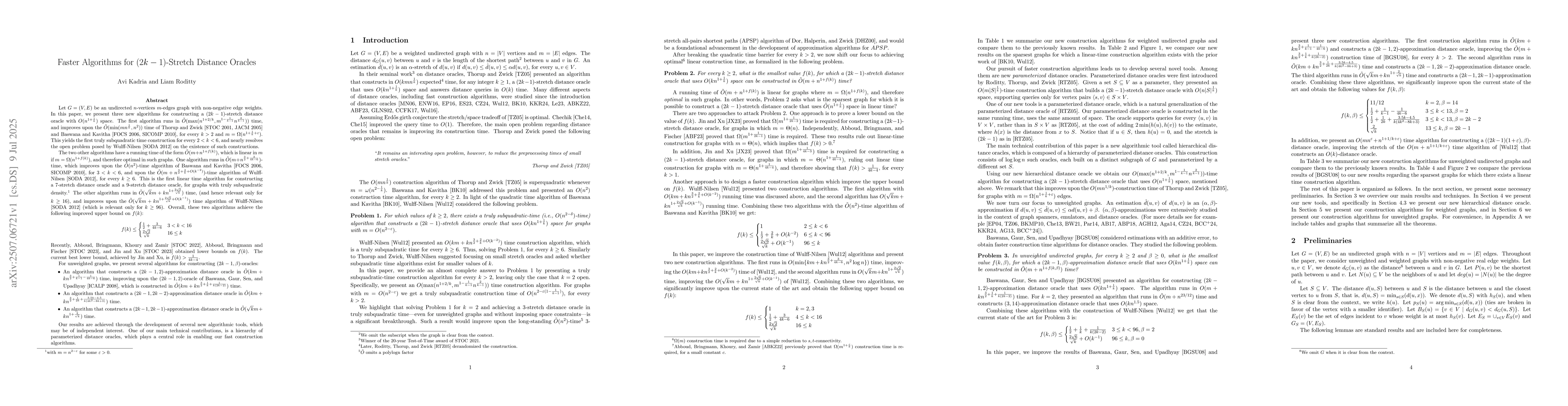 Let $G=(V, E)$ be an undirected $n$-vertices $m$-edges graph with non-negative edge weights. In this paper, we present three new algorithms for constructing a $(2k-1)$-stretch distance oracle with $O(n^{1+\frac{1}{k}})$ space. The first algorithm runs in $\Ot(\max(n^{1+2/k}, m^{1-\frac{1}{k-1}}n^{\frac{2}{k-1}}))$ time, and improves upon the $\Ot(\min(mn^{\frac{1}{k}},n^2))$ time of Thorup and Zwick [STOC 2001, JACM 2005] and Baswana and Kavitha [FOCS 2006, SICOMP 2010], for every $k > 2$ and $m=\Omega(n^{1+\frac{1}{k}+\eps})$. This yields the first truly subquadratic time construction for every $2 < k < 6$, and nearly resolves the open problem posed by Wulff-Nilsen [SODA 2012] on the existence of such constructions. The two other algorithms have a running time of the form $\Ot(m+n^{1+f(k)})$, which is near linear in $m$ if $m=\Omega(n^{1+f(k)})$, and therefore optimal in such graphs. One algorithm runs in $\Ot(m+n^{\frac32+\frac{3}{4k-6}})$-time, which improves upon the $\Ot(n^2)$-time algorithm of Baswana and Kavitha [FOCS 2006, SICOMP 2010], for $3 < k < 6$, and upon the $\Ot(m+n^{\frac{3}{2}+\frac{2}{k}+O(k^{-2})})$-time algorithm of Wulff-Nilsen [SODA 2012], for every $k\geq 6$. This is the first linear time algorithm for constructing a $7$-stretch distance oracle and a $9$-stretch distance oracle, for graphs with truly subquadratic density.\footnote{with $m=n^{2-\eps}$ for some $\eps > 0$.} The other algorithm runs in $\Ot(\sqrt{k}m+kn^{1+\frac{2\sqrt{2}}{\sqrt{k}}})$ time, (and hence relevant only for $k\ge 16$), and improves upon the $\Ot(\sqrt{k}m+kn^{1+\frac{2\sqrt{6}}{\sqrt{k}}+O(k^{-1})})$ time algorithm of Wulff-Nilsen [SODA 2012] (which is relevant only for $k\ge 96$). ...