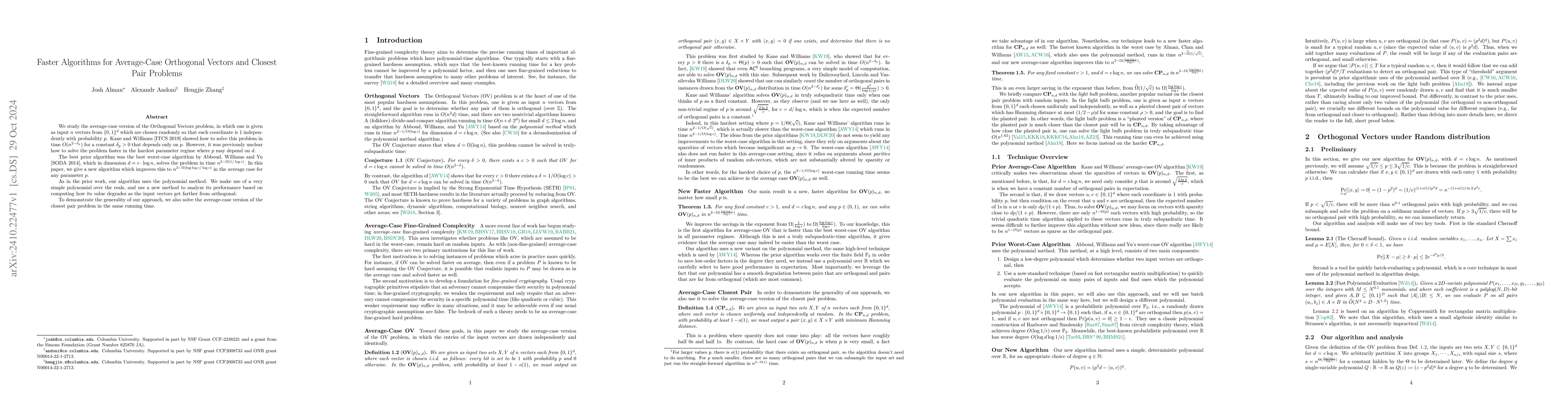 We study the average-case version of the Orthogonal Vectors problem, in which one is given as input $n$ vectors from $\{0,1\}^d$ which are chosen randomly so that each coordinate is $1$ independently with probability $p$. Kane and Williams [ITCS 2019] showed how to solve this problem in time $O(n^{2 - \delta_p})$ for a constant $\delta_p > 0$ that depends only on $p$. However, it was previously unclear how to solve the problem faster in the hardest parameter regime where $p$ may depend on $d$. The best prior algorithm was the best worst-case algorithm by Abboud, Williams and Yu [SODA 2014], which in dimension $d = c \cdot \log n$, solves the problem in time $n^{2 - \Omega(1/\log c)}$. In this paper, we give a new algorithm which improves this to $n^{2 - \Omega(\log\log c /\log c)}$ in the average case for any parameter $p$. As in the prior work, our algorithm uses the polynomial method. We make use of a very simple polynomial over the reals, and use a new method to analyze its performance based on computing how its value degrades as the input vectors get farther from orthogonal. To demonstrate the generality of our approach, we also solve the average-case version of the closest pair problem in the same running time.