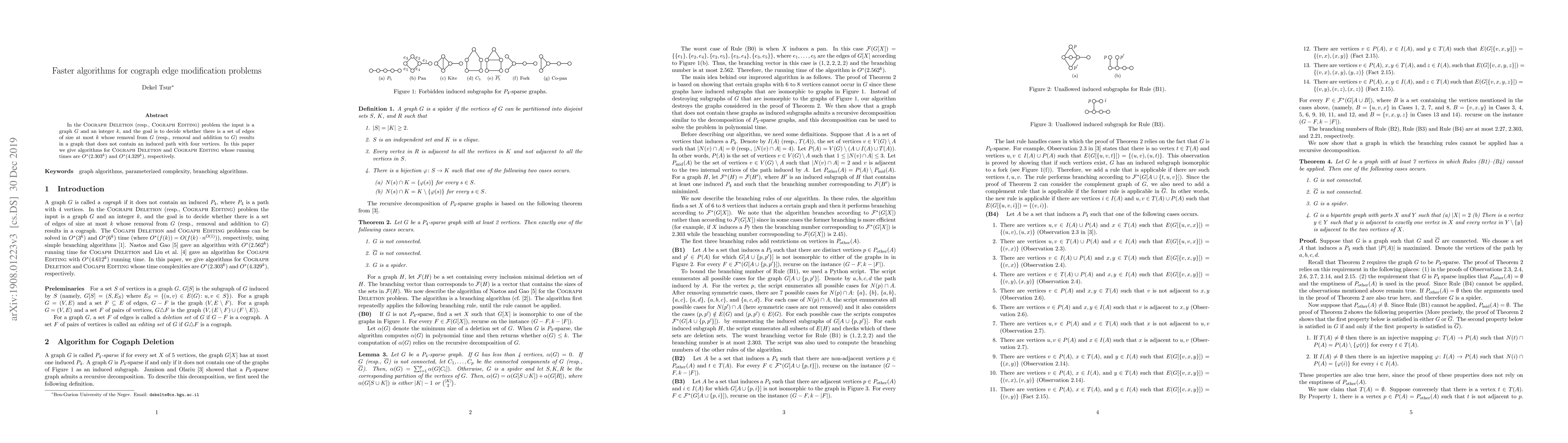 This paper presents improved algorithms for Cograph Deletion and Cograph Editing problems, achieving running times of $O^*(2.303^k)$ and $O^*(4.329^k)$ respectively, to determine if a set of edges can modify the graph to avoid four-vertex induced paths.