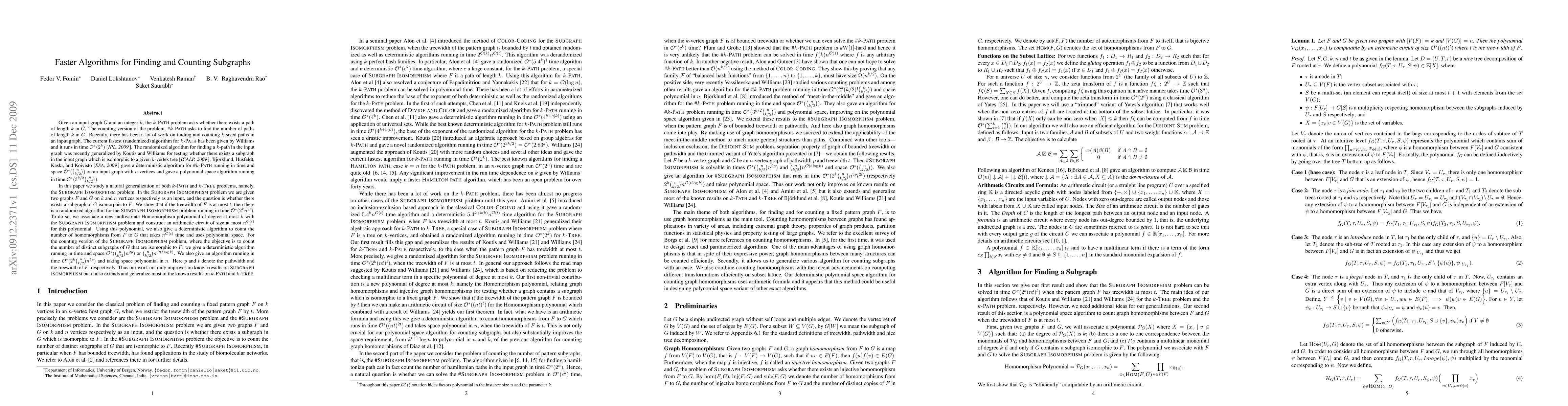 In this paper we study a natural generalization of both {\sc $k$-Path} and {\sc $k$-Tree} problems, namely, the {\sc Subgraph Isomorphism} problem. In the {\sc Subgraph Isomorphism} problem we are given two graphs $F$ and $G$ on $k$ and $n$ vertices respectively as an input, and the question is whether there exists a subgraph of $G$ isomorphic to $F$. We show that if the treewidth of $F$ is at most $t$, then there is a randomized algorithm for the {\sc Subgraph Isomorphism} problem running in time $\cO^*(2^k n^{2t})$. To do so, we associate a new multivariate {Homomorphism polynomial} of degree at most $k$ with the {\sc Subgraph Isomorphism} problem and construct an arithmetic circuit of size at most $n^{\cO(t)}$ for this polynomial. Using this polynomial, we also give a deterministic algorithm to count the number of homomorphisms from $F$ to $G$ that takes $n^{\cO(t)}$ time and uses polynomial space. For the counting version of the {\sc Subgraph Isomorphism} problem, where the objective is to count the number of distinct subgraphs of $G$ that are isomorphic to $F$, we give a deterministic algorithm running in time and space $\cO^*({n \choose k/2}n^{2p})$ or ${n\choose k/2}n^{\cO(t \log k)}$. We also give an algorithm running in time $\cO^{*}(2^{k}{n \choose k/2}n^{5p})$ and taking space polynomial in $n$. Here $p$ and $t$ denote the pathwidth and the treewidth of $F$, respectively. Thus our work not only improves on known results on {\sc Subgraph Isomorphism} but it also extends and generalize most of the known results on {\sc $k$-Path} and {\sc $k$-Tree}.