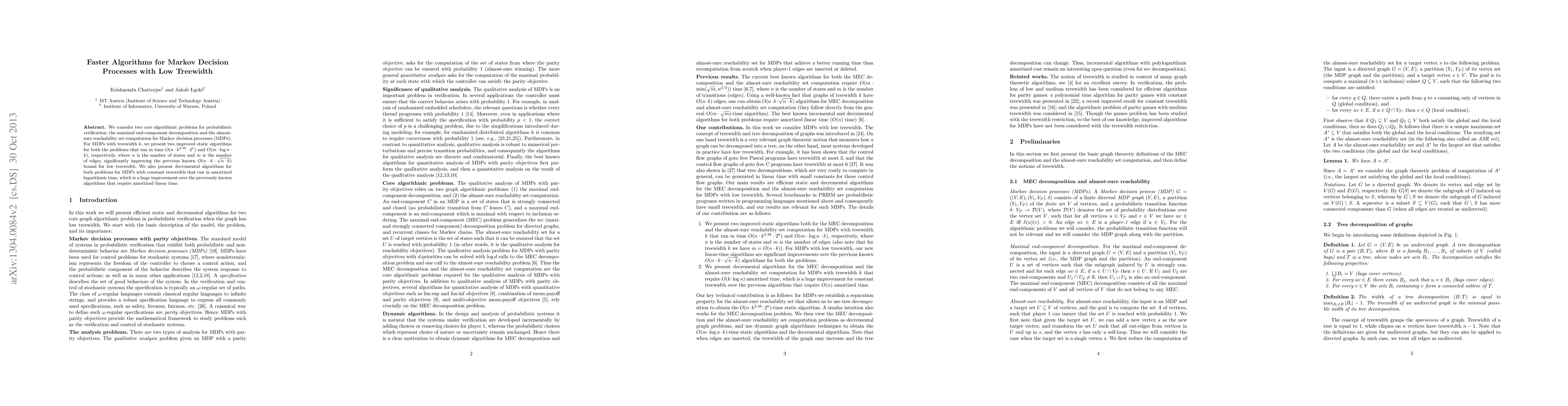 This paper presents faster algorithms for solving Markov Decision Process problems with low treewidth, improving upon previous bounds in time complexity.