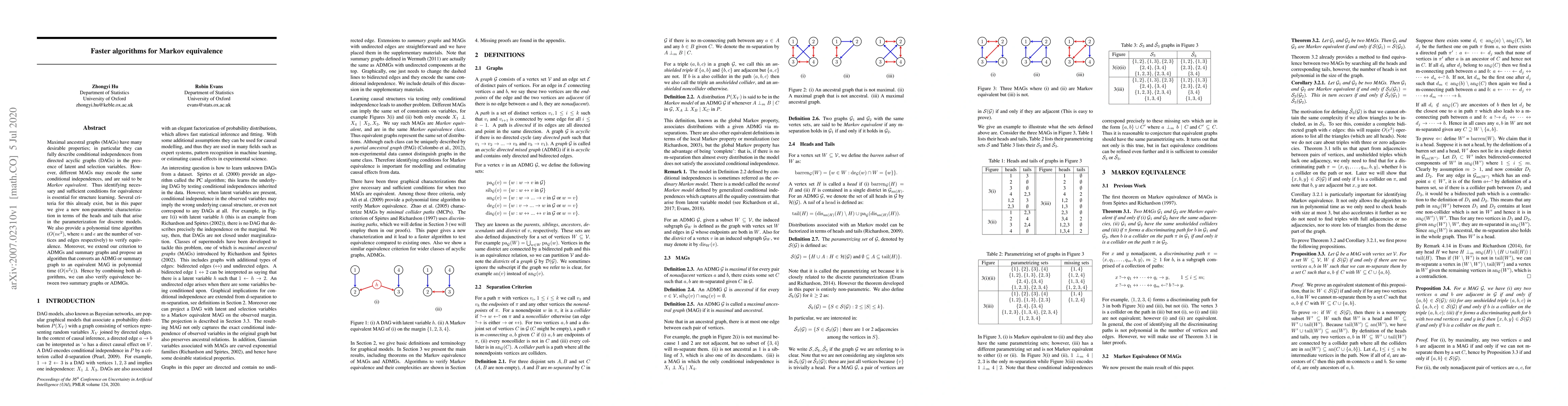Maximal ancestral graphs (MAGs) have many desirable properties; in particular they can fully describe conditional independences from directed acyclic graphs (DAGs) in the presence of latent and selection variables. However, different MAGs may encode the same conditional independences, and are said to be \emph{Markov equivalent}. Thus identifying necessary and sufficient conditions for equivalence is essential for structure learning. Several criteria for this already exist, but in this paper we give a new non-parametric characterization in terms of the heads and tails that arise in the parameterization for discrete models. We also provide a polynomial time algorithm ($O(ne^{2})$, where $n$ and $e$ are the number of vertices and edges respectively) to verify equivalence. Moreover, we extend our criterion to ADMGs and summary graphs and propose an algorithm that converts an ADMG or summary graph to an equivalent MAG in polynomial time ($O(n^{2}e)$). Hence by combining both algorithms, we can also verify equivalence between two summary graphs or ADMGs.