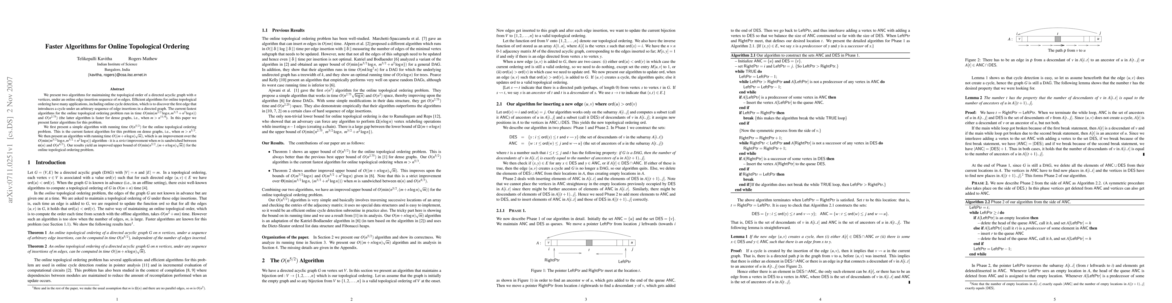 Researchers have developed two efficient algorithms for maintaining topological order in directed acyclic graphs under online edge insertion sequences, achieving improved bounds on the time complexity for dense and sparse graphs.
