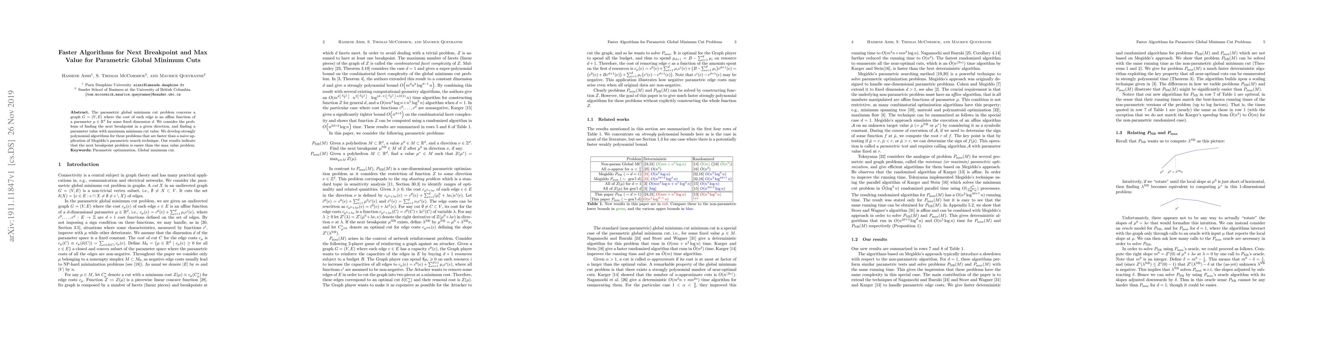 The parametric global minimum cut problem concerns a graph $G = (V,E)$ where the cost of each edge is an affine function of a parameter $\mu \in \mathbb{R}^d$ for some fixed dimension $d$. We consider the problems of finding the next breakpoint in a given direction, and finding a parameter value with maximum minimum cut value. We develop strongly polynomial algorithms for these problems that are faster than a naive application of Megiddo's parametric search technique. Our results indicate that the next breakpoint problem is easier than the max value problem.