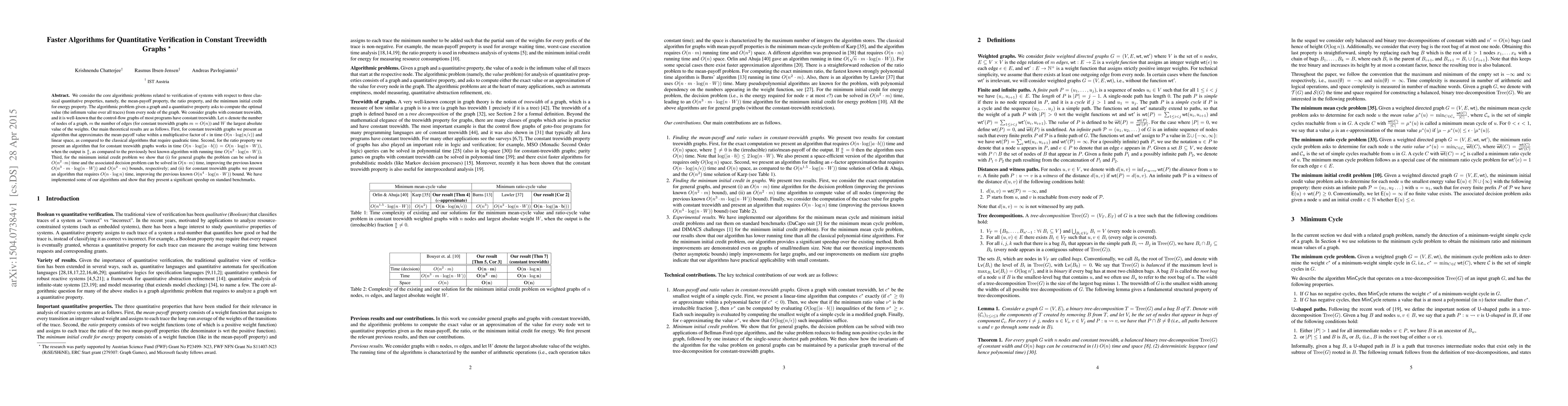 We consider the core algorithmic problems related to verification of systems with respect to three classical quantitative properties, namely, the mean-payoff property, the ratio property, and the minimum initial credit for energy property. The algorithmic problem given a graph and a quantitative property asks to compute the optimal value (the infimum value over all traces) from every node of the graph. We consider graphs with constant treewidth, and it is well-known that the control-flow graphs of most programs have constant treewidth. Let $n$ denote the number of nodes of a graph, $m$ the number of edges (for constant treewidth graphs $m=O(n)$) and $W$ the largest absolute value of the weights. Our main theoretical results are as follows. First, for constant treewidth graphs we present an algorithm that approximates the mean-payoff value within a multiplicative factor of $\epsilon$ in time $O(n \cdot \log (n/\epsilon))$ and linear space, as compared to the classical algorithms that require quadratic time. Second, for the ratio property we present an algorithm that for constant treewidth graphs works in time $O(n \cdot \log (|a\cdot b|))=O(n\cdot\log (n\cdot W))$, when the output is $\frac{a}{b}$, as compared to the previously best known algorithm with running time $O(n^2 \cdot \log (n\cdot W))$. Third, for the minimum initial credit problem we show that (i) for general graphs the problem can be solved in $O(n^2\cdot m)$ time and the associated decision problem can be solved in $O(n\cdot m)$ time, improving the previous known $O(n^3\cdot m\cdot \log (n\cdot W))$ and $O(n^2 \cdot m)$ bounds, respectively; and (ii) for constant treewidth graphs we present an algorithm that requires $O(n\cdot \log n)$ time, improving the previous known $O(n^4 \cdot \log (n \cdot W))$ bound.