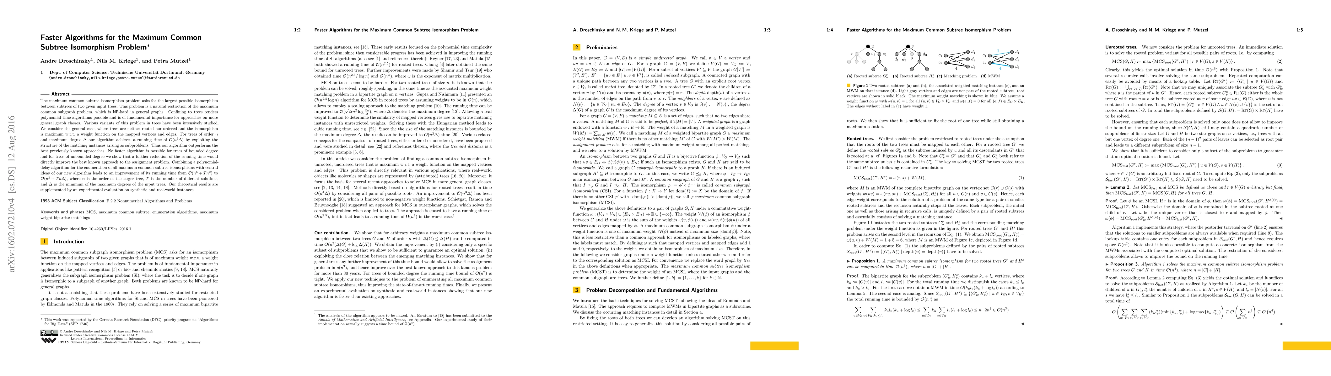 This paper presents a new algorithm achieving a running time of $\mathcal{O}(n^2\Delta)$ for the maximum common subtree isomorphism problem in trees, outperforming previous methods. The authors also improve the enumeration of all maximum common subtree isomorphisms, reducing the running time to $\mathcal{O}(n^3+Tn\Delta)$. Experimental results validate the theoretical improvements.