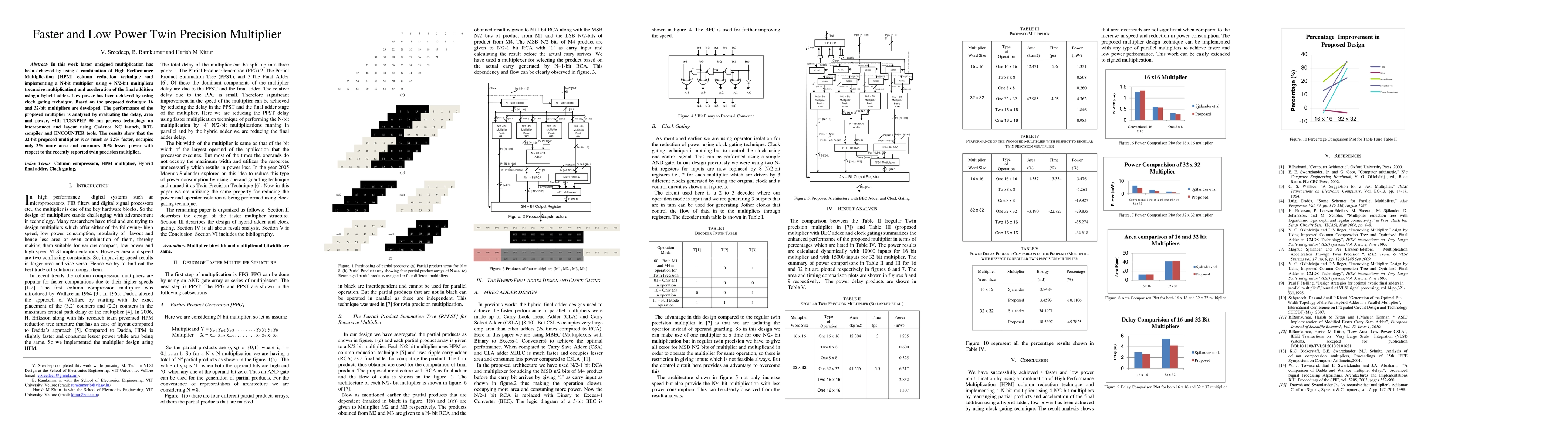 In this work faster unsigned multiplication has been achieved by using a combination of High Performance Multiplication [HPM] column reduction technique and implementing a N-bit multiplier using 4 N/2-bit multipliers (recursive multiplication) and acceleration of the final addition using a hybrid adder. Low power has been achieved by using clock gating technique. Based on the proposed technique 16 and 32-bit multipliers are developed. The performance of the proposed multiplier is analyzed by evaluating the delay, area and power, with TCBNPHP 90 nm process technology on interconnect and layout using Cadence NC launch, RTL compiler and ENCOUNTER tools. The results show that the 32-bit proposed multiplier is as much as 22% faster, occupies only 3% more area and consumes 30% lesser power with respect to the recently reported twin precision multiplier.