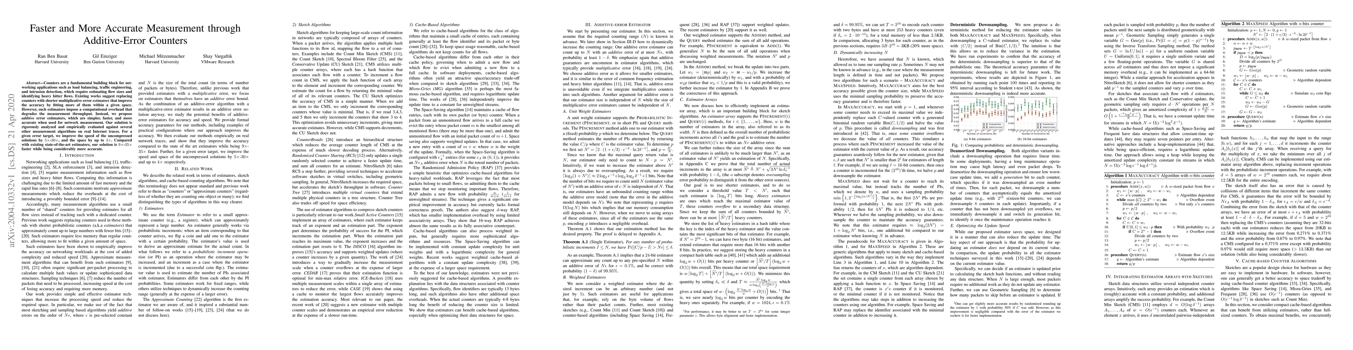This paper proposes additive-error counters for faster and more accurate network measurement compared to existing multiplicative error estimators. The proposed solution significantly improves throughput and space efficiency while maintaining higher accuracy, achieving up to 35 times faster performance than state-of-the-art methods.