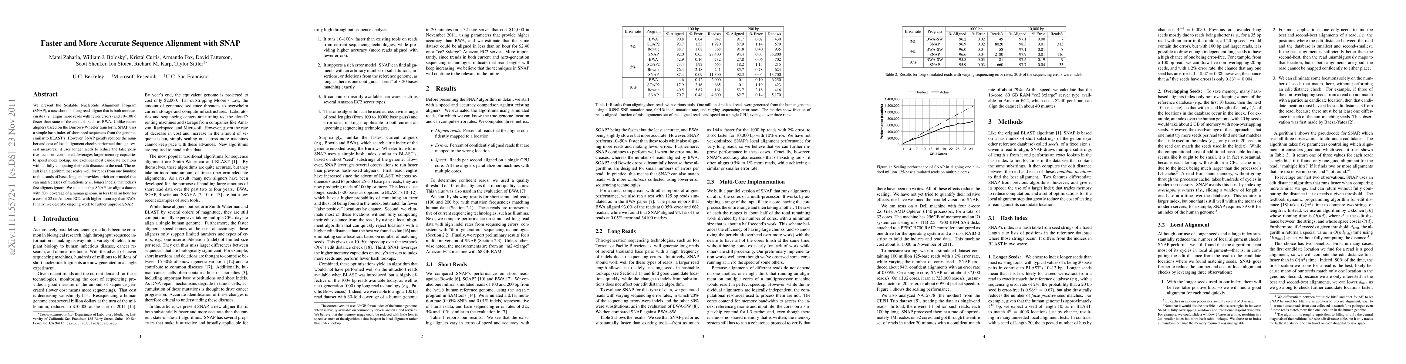 We present the Scalable Nucleotide Alignment Program (SNAP), a new short and long read aligner that is both more accurate (i.e., aligns more reads with fewer errors) and 10-100x faster than state-of-the-art tools such as BWA. Unlike recent aligners based on the Burrows-Wheeler transform, SNAP uses a simple hash index of short seed sequences from the genome, similar to BLAST's. However, SNAP greatly reduces the number and cost of local alignment checks performed through several measures: it uses longer seeds to reduce the false positive locations considered, leverages larger memory capacities to speed index lookup, and excludes most candidate locations without fully computing their edit distance to the read. The result is an algorithm that scales well for reads from one hundred to thousands of bases long and provides a rich error model that can match classes of mutations (e.g., longer indels) that today's fast aligners ignore. We calculate that SNAP can align a dataset with 30x coverage of a human genome in less than an hour for a cost of $2 on Amazon EC2, with higher accuracy than BWA. Finally, we describe ongoing work to further improve SNAP.