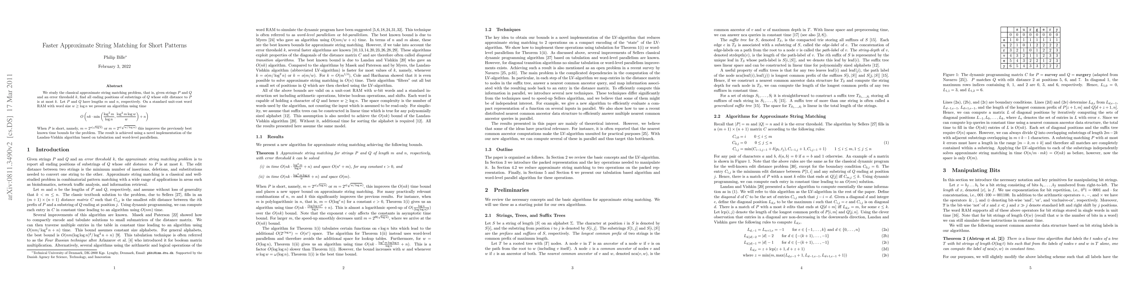 The paper's main technical contribution is an efficient implementation of the Landau-Vishkin algorithm for approximate string matching, incorporating tabulation and word-level parallelism to achieve improved time complexity for short patterns.