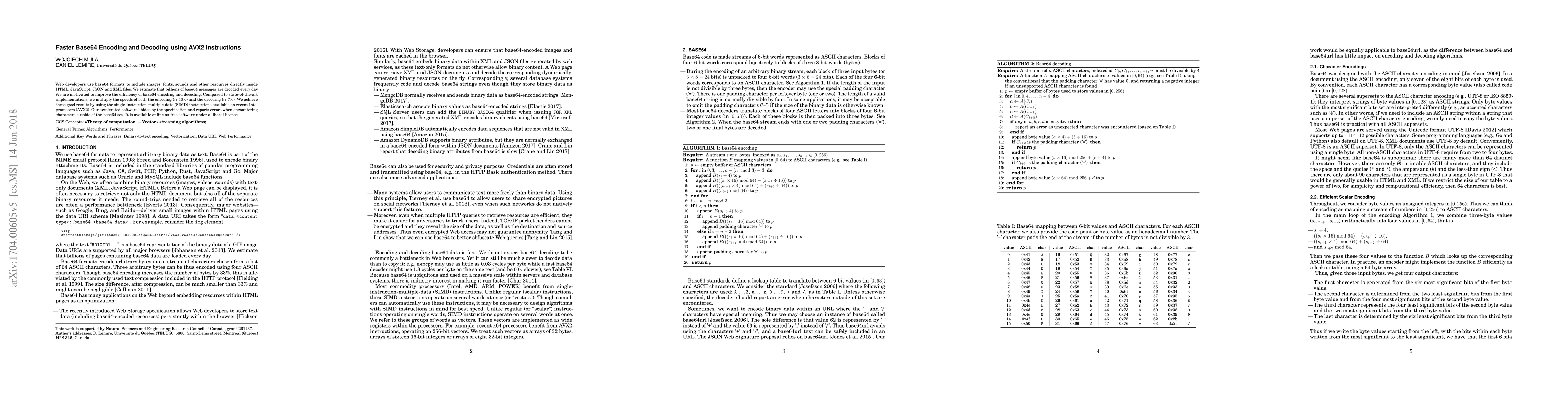 The paper presents efficient algorithms and implementations for Base64 encoding and decoding using AVX2 instructions, significantly improving performance.