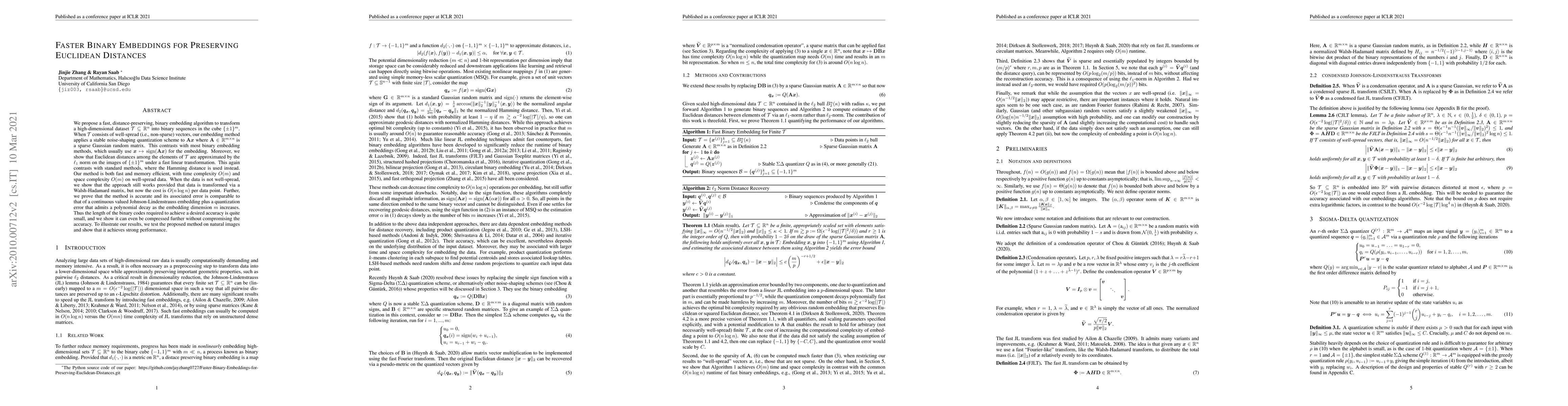 We propose a fast, distance-preserving, binary embedding algorithm to transform a high-dimensional dataset $\mathcal{T}\subseteq\mathbb{R}^n$ into binary sequences in the cube $\{\pm 1\}^m$. When $\mathcal{T}$ consists of well-spread (i.e., non-sparse) vectors, our embedding method applies a stable noise-shaping quantization scheme to $A x$ where $A\in\mathbb{R}^{m\times n}$ is a sparse Gaussian random matrix. This contrasts with most binary embedding methods, which usually use $x\mapsto \mathrm{sign}(Ax)$ for the embedding. Moreover, we show that Euclidean distances among the elements of $\mathcal{T}$ are approximated by the $\ell_1$ norm on the images of $\{\pm 1\}^m$ under a fast linear transformation. This again contrasts with standard methods, where the Hamming distance is used instead. Our method is both fast and memory efficient, with time complexity $O(m)$ and space complexity $O(m)$. Further, we prove that the method is accurate and its associated error is comparable to that of a continuous valued Johnson-Lindenstrauss embedding plus a quantization error that admits a polynomial decay as the embedding dimension $m$ increases. Thus the length of the binary codes required to achieve a desired accuracy is quite small, and we show it can even be compressed further without compromising the accuracy. To illustrate our results, we test the proposed method on natural images and show that it achieves strong performance.
