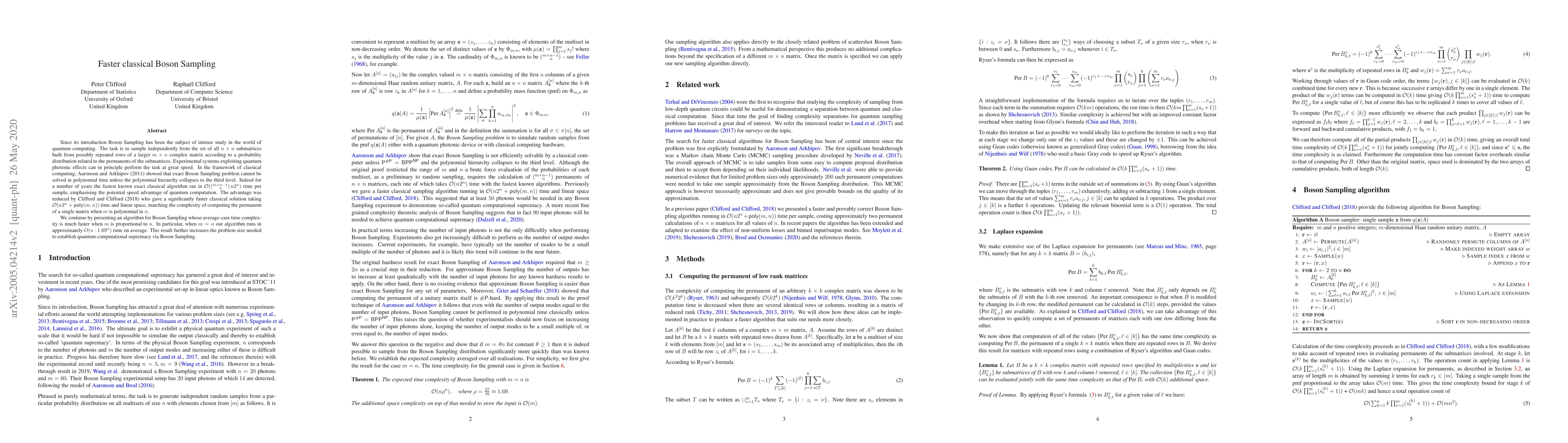 Since its introduction Boson Sampling has been the subject of intense study in the world of quantum computing. The task is to sample independently from the set of all $n \times n$ submatrices built from possibly repeated rows of a larger $m \times n$ complex matrix according to a probability distribution related to the permanents of the submatrices. Experimental systems exploiting quantum photonic effects can in principle perform the task at great speed. In the framework of classical computing, Aaronson and Arkhipov (2011) showed that exact Boson Sampling problem cannot be solved in polynomial time unless the polynomial hierarchy collapses to the third level. Indeed for a number of years the fastest known exact classical algorithm ran in $O({m+n-1 \choose n} n 2^n )$ time per sample, emphasising the potential speed advantage of quantum computation. The advantage was reduced by Clifford and Clifford (2018) who gave a significantly faster classical solution taking $O(n 2^n + \operatorname{poly}(m,n))$ time and linear space, matching the complexity of computing the permanent of a single matrix when $m$ is polynomial in $n$. We continue by presenting an algorithm for Boson Sampling whose average-case time complexity is much faster when $m$ is proportional to $n$. In particular, when $m = n$ our algorithm runs in approximately $O(n\cdot1.69^n)$ time on average. This result further increases the problem size needed to establish quantum computational supremacy via Boson Sampling.
