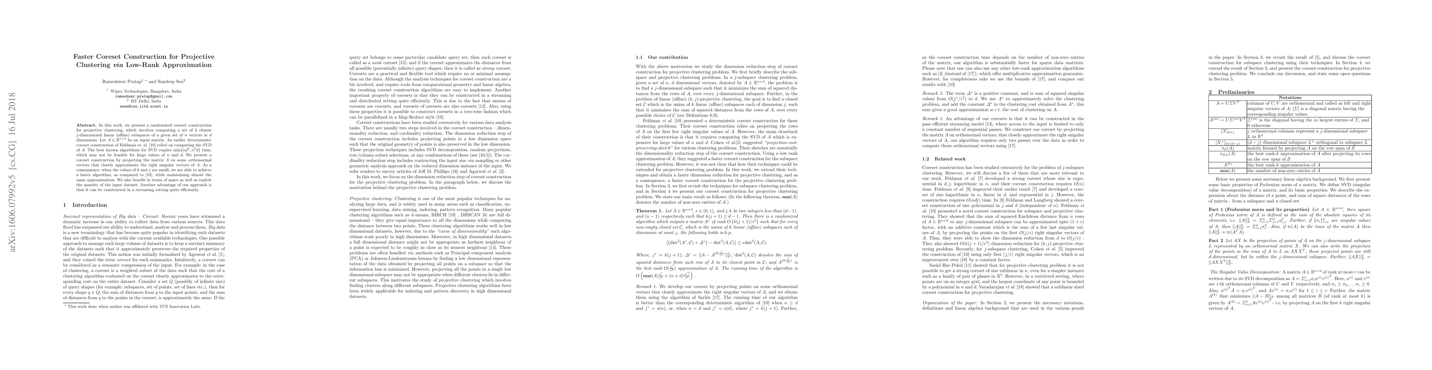 This paper proposes a randomized coreset construction for projective clustering that uses low-rank approximation to achieve faster computation compared to previous deterministic methods. The new approach leverages orthonormal vectors to approximate the right singular vectors, resulting in improved efficiency and space usage, especially when the number of clusters and dimensions are small.