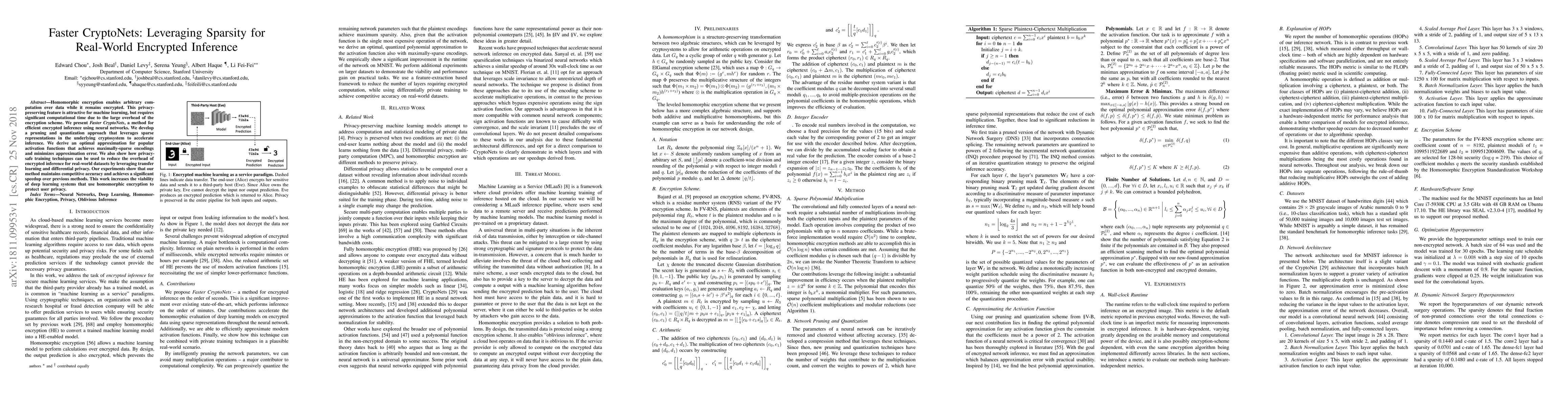 Researchers have developed Faster CryptoNets, a method that accelerates encrypted inference using neural networks by leveraging sparse representations and minimizing approximation error, achieving competitive accuracy while reducing computational time.