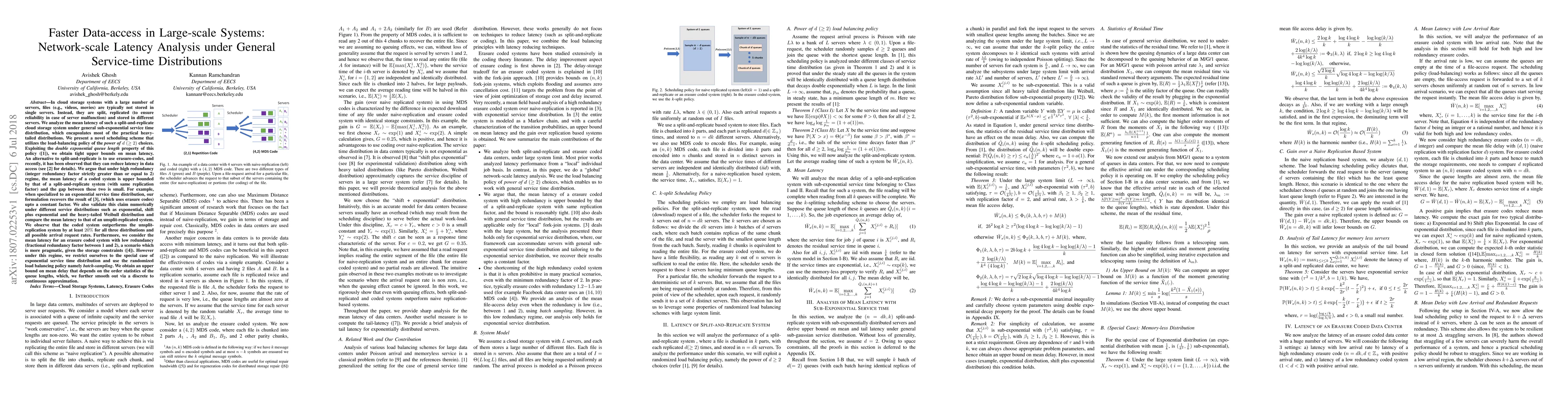 In cloud storage systems with a large number of servers, files are typically not stored in single servers. Instead, they are split, replicated (to ensure reliability in case of server malfunction) and stored in different servers. We analyze the mean latency of such a split-and-replicate cloud storage system under general sub-exponential service time. We present a novel scheduling scheme that utilizes the load-balancing policy of the \textit{power of $d$ $(\geq 2)$} choices. An alternative to split-and-replicate is to use erasure-codes, and recently, it has been observed that they can reduce latency in data access (see \cite{longbo_delay} for details). We argue that under high redundancy (integer redundancy factor strictly greater than or equal to 2) regime, the mean latency of a coded system is upper bounded by that of a split-and-replicate system (with same replication factor) and the gap between these two is small. We validate this claim numerically under different service distributions such as exponential, shift plus exponential and the heavy-tailed Weibull distribution and compare the mean latency to that of an unsplit-replicated system. We observe that the coded system outperforms the unsplit-replication system by at least $20\%$. Furthermore, we consider the mean latency for an erasure coded system with low redundancy (fractional redundancy factor between 1 and 2), a scenario which is more pragmatic, given the storage constraints (\cite{rashmi_thesis}). However under this regime, we restrict ourselves to the special case of exponential service time distribution and use the randomized load balancing policy namely \textit{batch-sampling}. We obtain an upper bound on mean delay that depends on the order statistics of the queue lengths, which, we further smooth out via a discrete to continuous approximation.