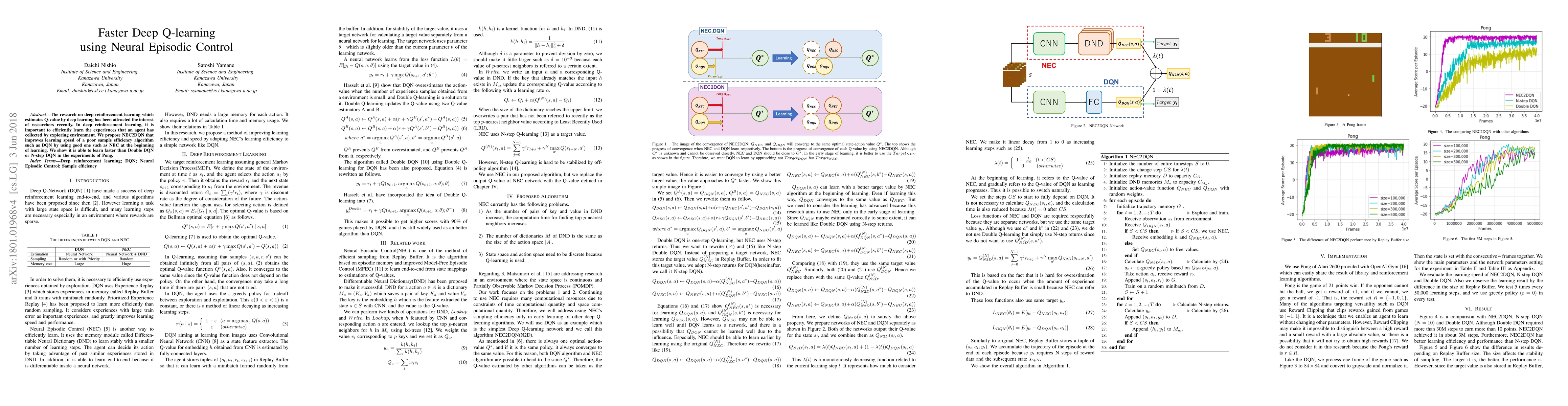 A new algorithm called NEC2DQN improves upon Deep Q-learning by using Neural Episodic Control to learn faster, outperforming Double DQN and N-step DQN in the game Pong.