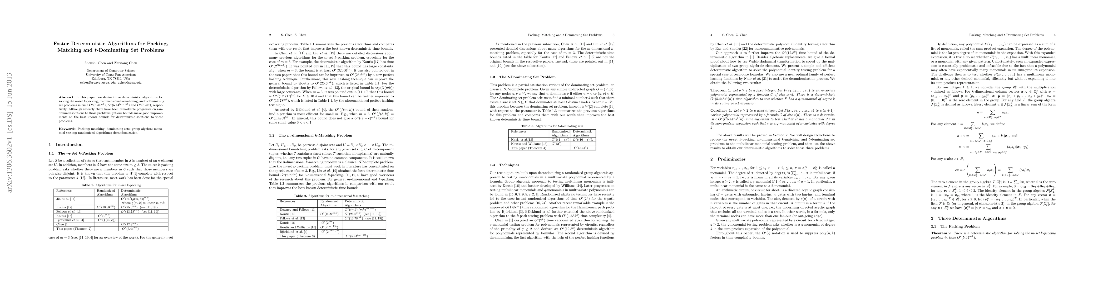 In this paper, we devise three deterministic algorithms for solving the $m$-set $k$-packing, $m$-dimensional $k$-matching, and $t$-dominating set problems in time $O^*(5.44^{mk})$, $O^*(5.44^{(m-1)k})$ and $O^*(5.44^{t})$, respectively. Although recently there has been remarkable progress on randomized solutions to those problems, our bounds make good improvements on the best known bounds for deterministic solutions to those problems.