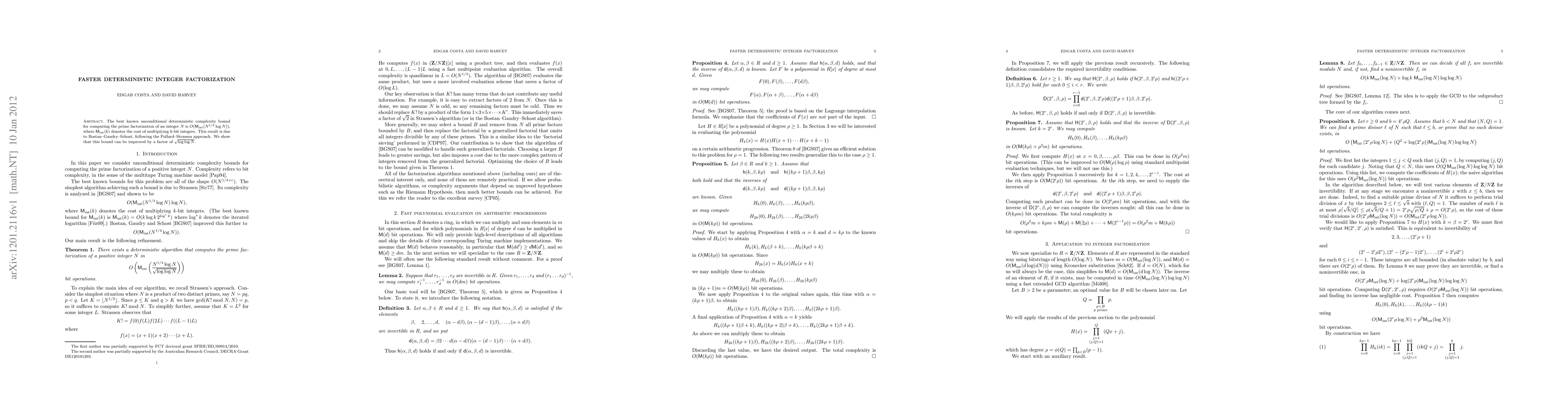 Summary: This paper improves the best-known deterministic complexity for integer factorization to O(M_int(N^(1/4) log N) (log log N)^(1/2)), enhancing the Pollard--Strassen approach by reducing the complexity factor.