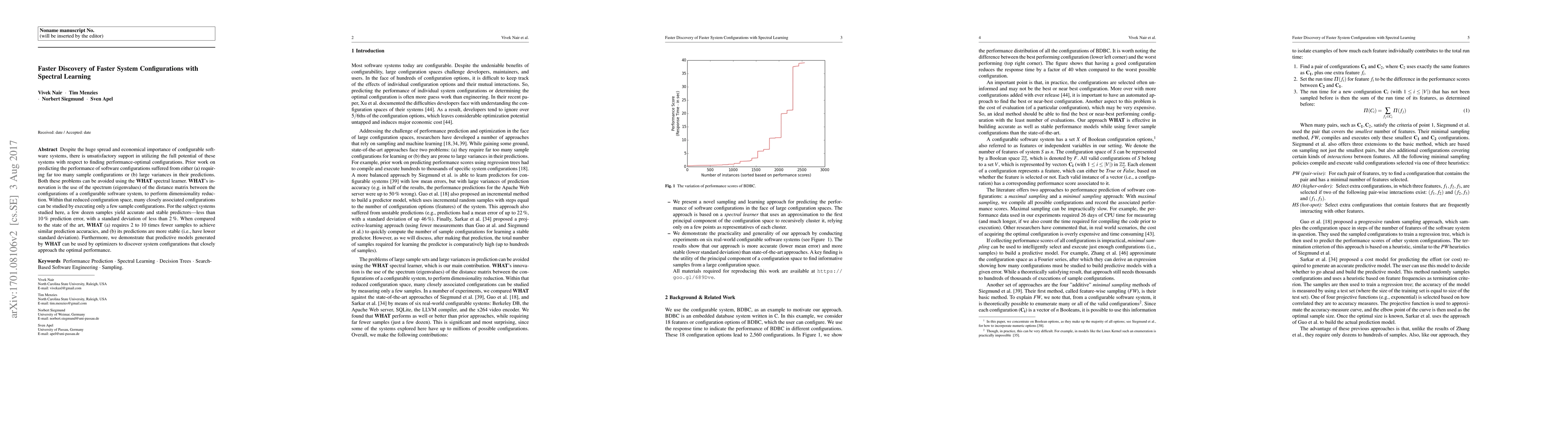 The research introduces WHAT, a spectral learner that uses configuration distance matrices' eigenvalues for dimensionality reduction. WHAT requires fewer samples and offers more stable predictions than previous methods, achieving less than 10% error and under 2% standard deviation. It also aids optimizers in discovering high-performance system configurations.