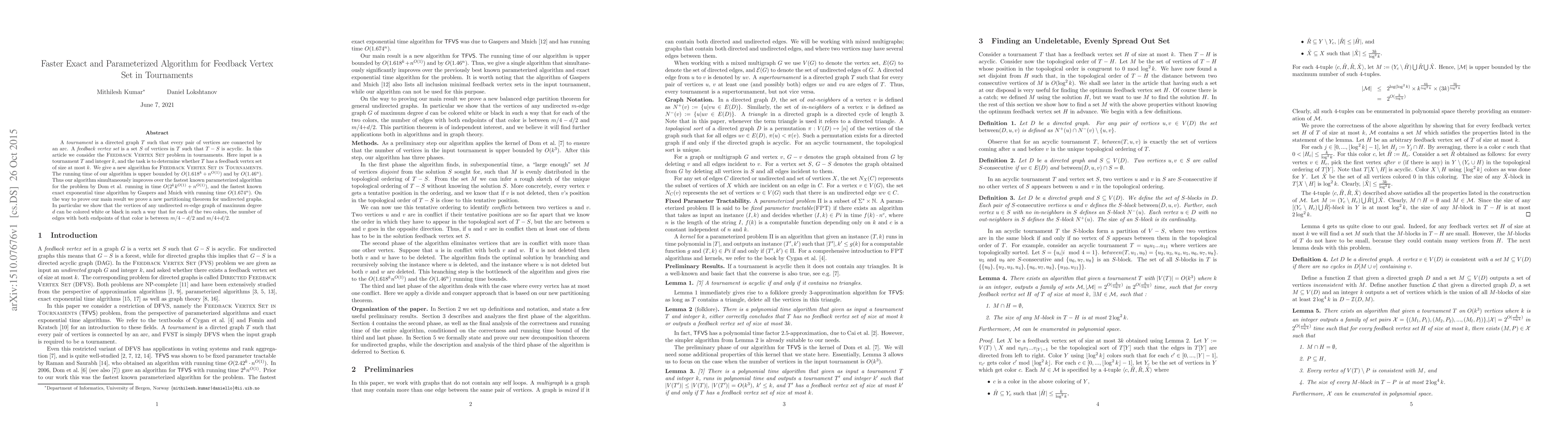 This paper presents an improved algorithm for solving the Feedback Vertex Set problem in tournaments, achieving a running time of O(1.618^k + n^{O(1)}) and O(1.46^n). This outperforms both the fastest known parameterized and exact exponential time algorithms. The authors also introduce a new partitioning theorem for undirected graphs to support their results.