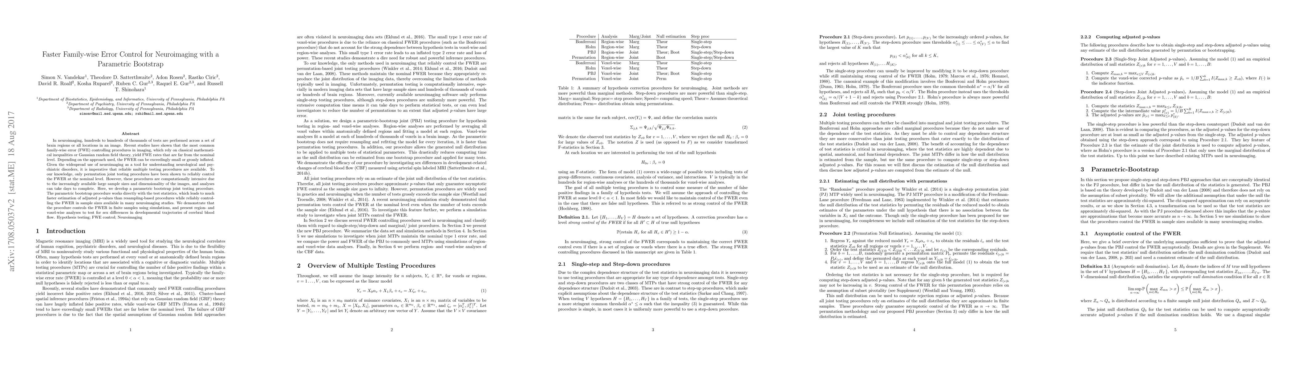 In neuroimaging, hundreds to hundreds of thousands of tests are performed across a set of brain regions or all locations in an image. Recent studies have shown that the most common family-wise error (FWE) controlling procedures in imaging, which rely on classical mathematical inequalities or Gaussian random field theory, yield FWE rates that are far from the nominal level. Depending on the approach used, the FWER can be exceedingly small or grossly inflated. Given the widespread use of neuroimaging as a tool for understanding neurological and psychiatric disorders, it is imperative that reliable multiple testing procedures are available. To our knowledge, only permutation joint testing procedures have been shown to reliably control the FWER at the nominal level. However, these procedures are computationally intensive due to the increasingly available large sample sizes and dimensionality of the images, and analyses can take days to complete. Here, we develop a parametric bootstrap joint testing procedure. The parametric bootstrap procedure works directly with the test statistics, which leads to much faster estimation of adjusted \emph{p}-values than resampling-based procedures while reliably controlling the FWER in sample sizes available in many neuroimaging studies. We demonstrate that the procedure controls the FWER in finite samples using simulations, and present region- and voxel-wise analyses to test for sex differences in developmental trajectories of cerebral blood flow.