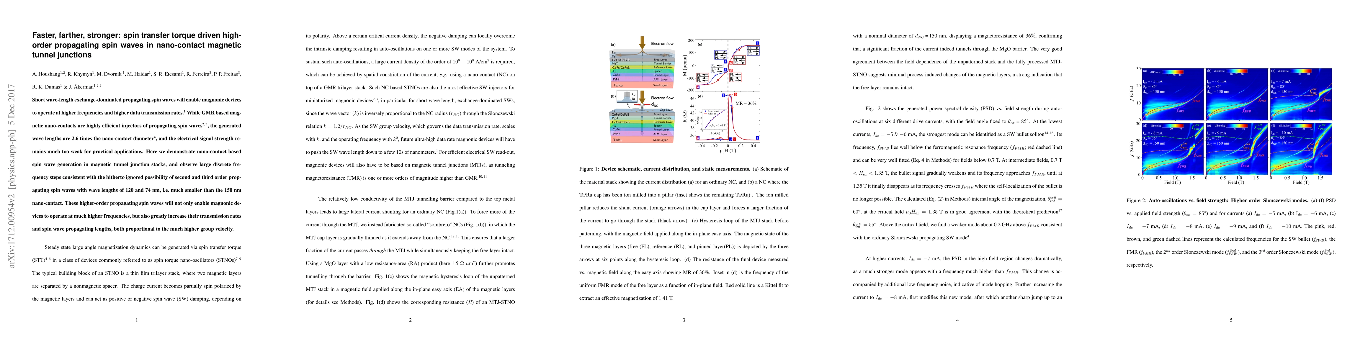This paper demonstrates the generation of high-order propagating spin waves in magnetic tunnel junctions using nano-contacts, achieving significantly smaller wavelengths than previously possible. These higher-order spin waves enable magnonic devices to operate at higher frequencies and data transmission rates due to their increased group velocity.
