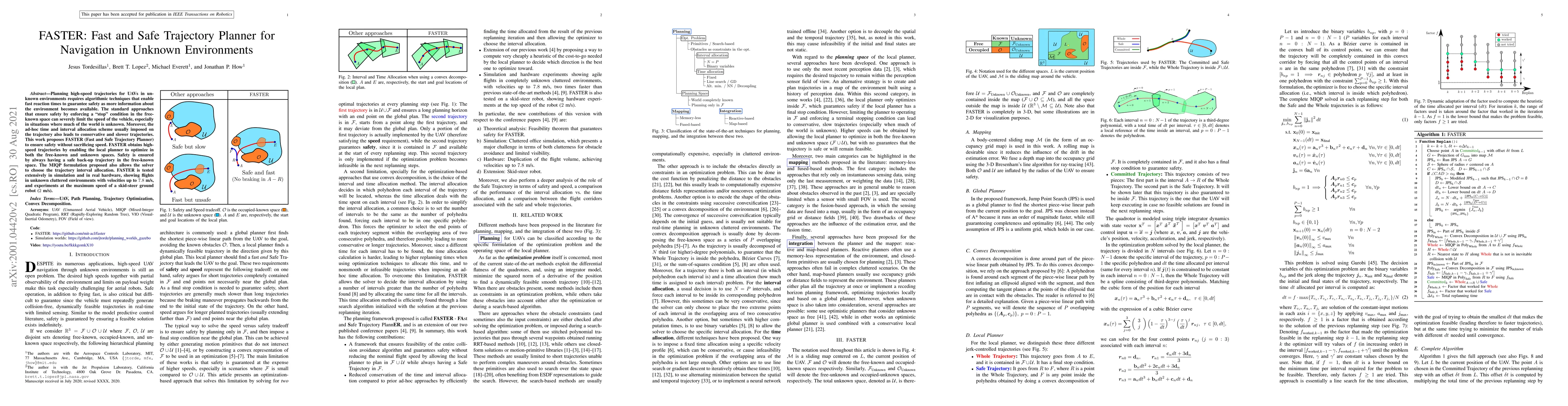 FASTER is a novel trajectory planner for UAVs that optimizes speed and safety in unknown environments by enabling local planning in both known and unknown spaces, while maintaining a safe back-up trajectory. It demonstrates high-speed navigation in simulations and real-world tests, achieving velocities up to 7.8m/s for UAVs and 2m/s for ground robots.