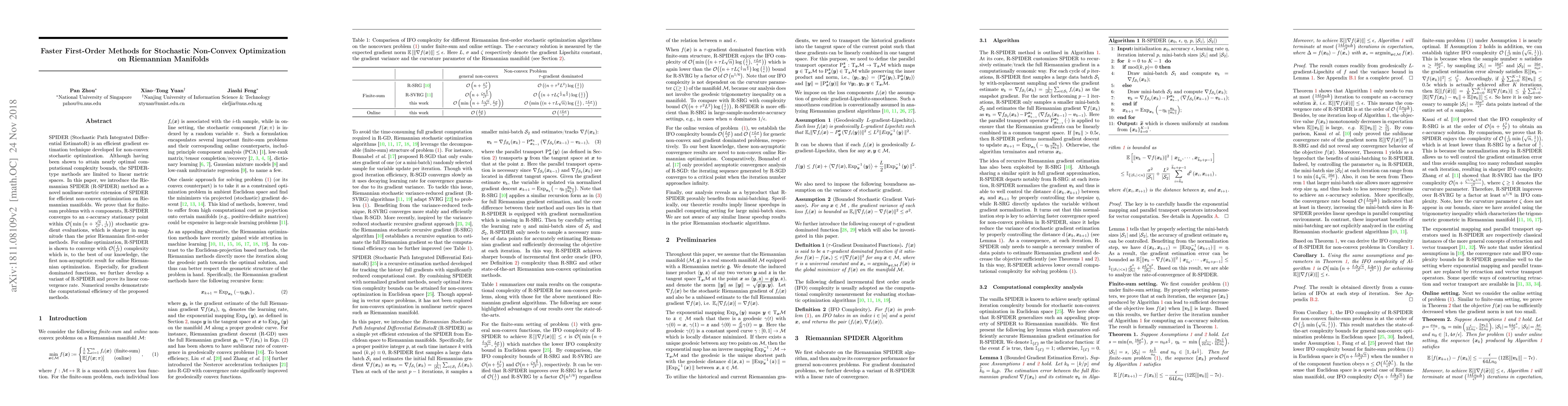 The paper introduces the Riemannian SPIDER (R-SPIDER) method for efficient non-convex optimization on Riemannian manifolds, proving faster convergence rates compared to existing methods and presenting the first non-asymptotic result for online Riemannian optimization. Numerical results confirm the computational efficiency of the proposed approach.