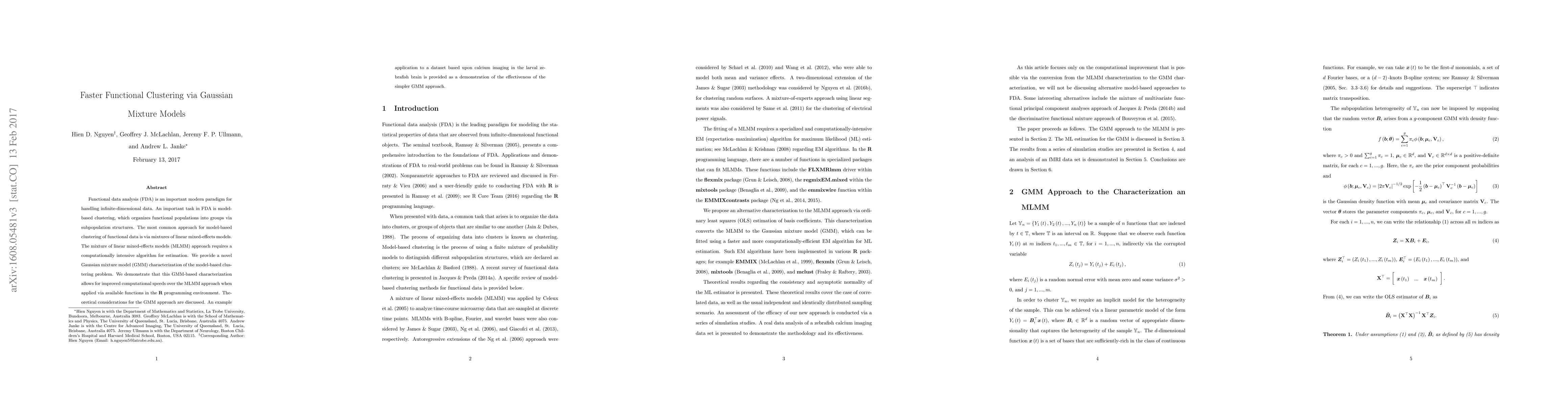 This paper proposes a Gaussian mixture model (GMM) for faster functional clustering compared to the traditional mixture of linear mixed-effects models (MLMM). The GMM approach demonstrates improved computational efficiency and is exemplified through an application to calcium imaging data in larval zebrafish.