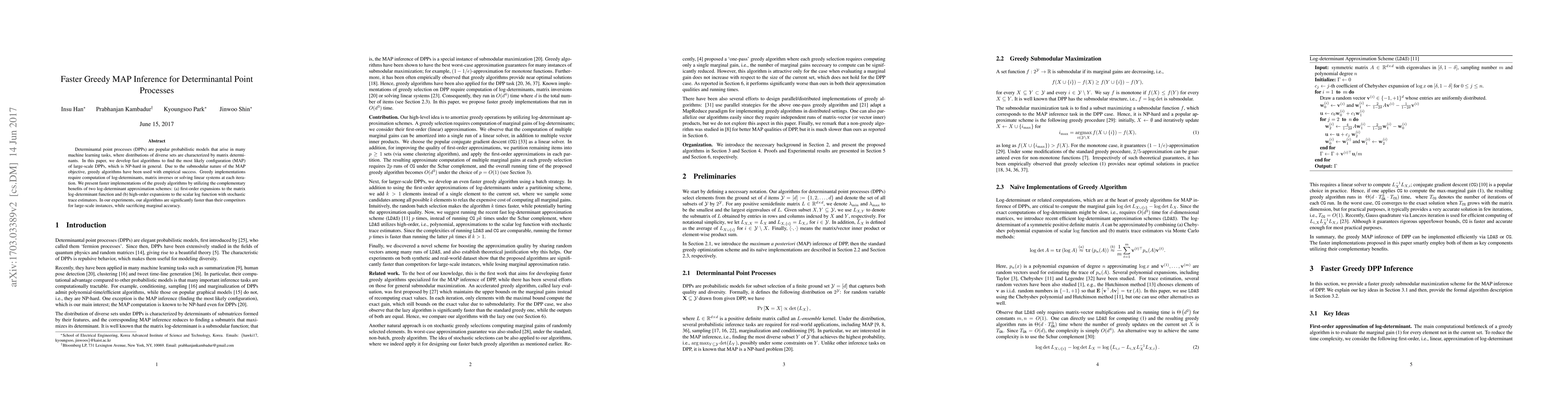 This paper develops faster greedy algorithms for finding the most likely configuration (MAP) of large-scale determinantal point processes (DPPs) by employing two log-determinant approximation schemes, significantly improving computational efficiency compared to existing methods. The proposed algorithms achieve substantial speedups at the cost of slight reductions in accuracy.