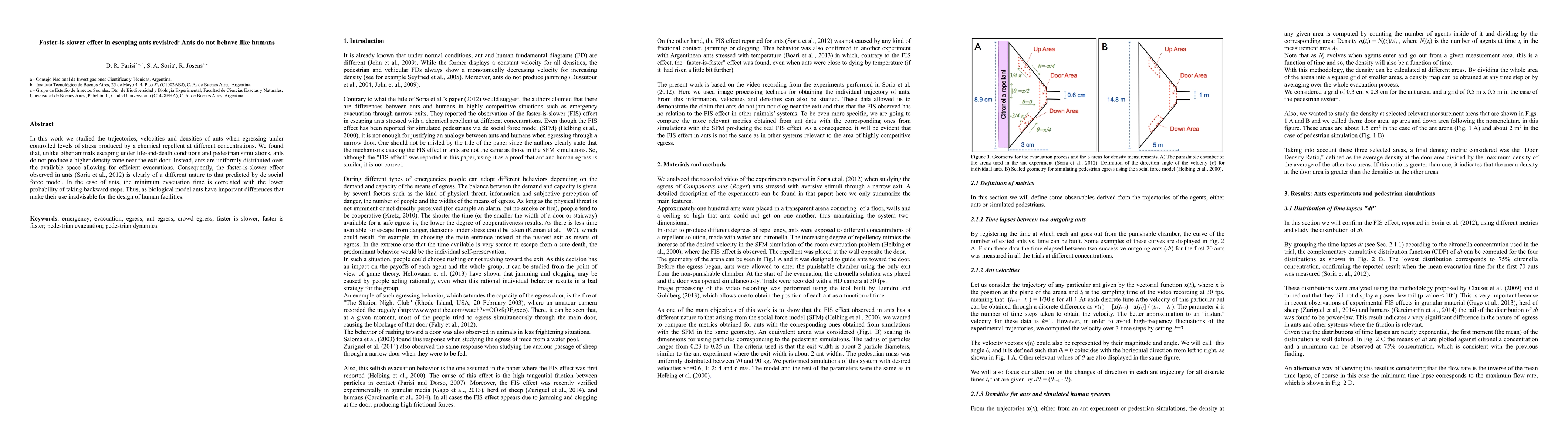 In this work we studied the trajectories, velocities and densities of ants when egressing under controlled levels of stress produced by a chemical repellent at different concentrations. We found that, unlike other animals escaping under life-and-death conditions and pedestrian simulations, ants do not produce a higher density zone near the exit door. Instead, ants are uniformly distributed over the available space allowing for efficient evacuations. Consequently, the faster-is-slower effect observed in ants (Soria et al., 2012) is clearly of a different nature to that predicted by de social force model. In the case of ants, the minimum evacuation time is correlated with the lower probability of taking backward steps. Thus, as biological model ants have important differences that make their use inadvisable for the design of human facilities.