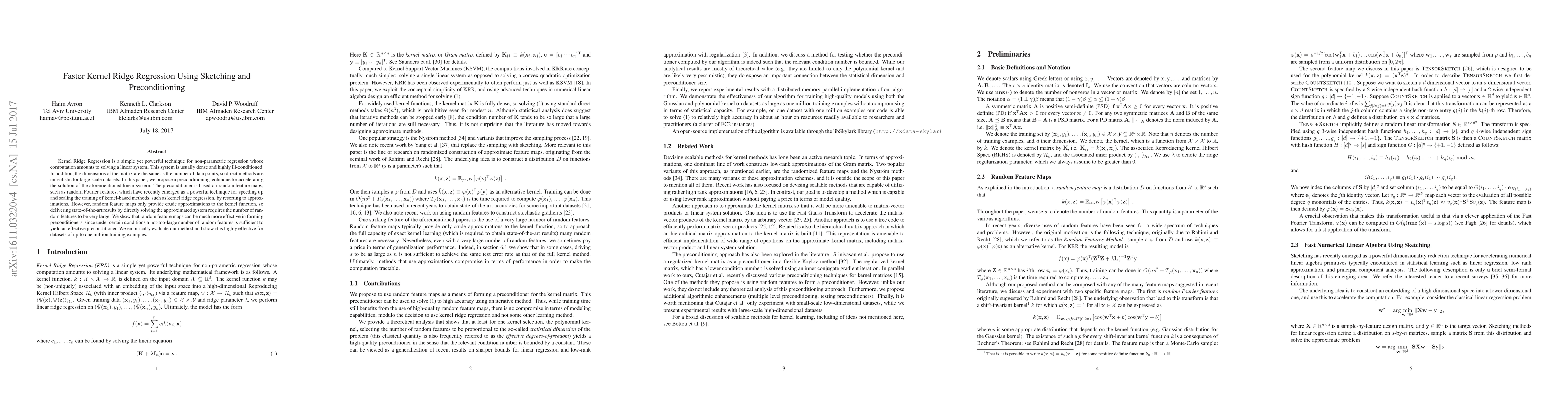This paper proposes a preconditioning technique using random feature maps to accelerate the solution of the linear system in Kernel Ridge Regression, demonstrating significant speedups for large-scale datasets without sacrificing accuracy. The method effectively leverages a smaller number of random features compared to direct approximations.
