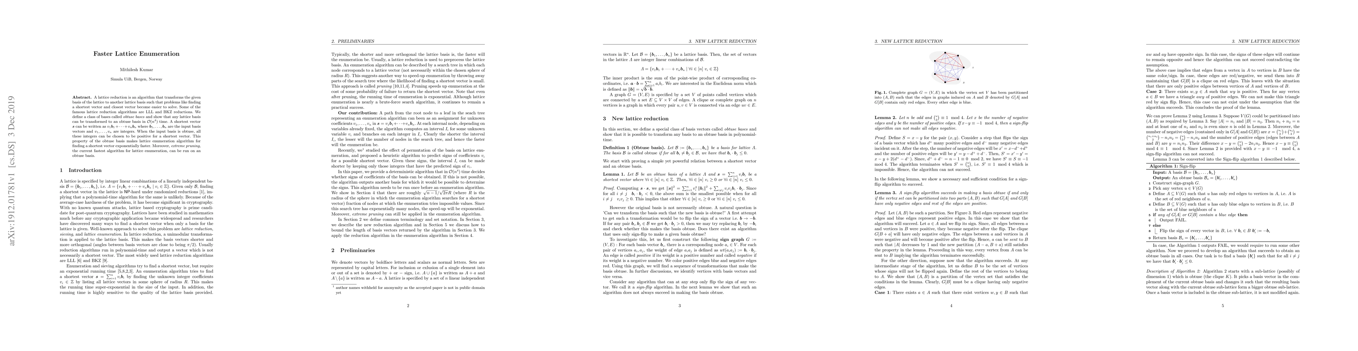 A lattice reduction is an algorithm that transforms the given basis of the lattice to another lattice basis such that problems like finding a shortest vector and closest vector become easier to solve. Some of the famous lattice reduction algorithms are LLL and BKZ reductions. We define a class of bases called \emph{obtuse bases} and show that any lattice basis can be transformed to an obtuse basis in $\mathcal{O}(n^4)$ time. A shortest vector s can be written as $v_1b_1+\cdots+v_nb_n$ where $b_1,\dots,b_n$ are the input basis vectors and $v_1,\dots,v_n$ are integers. When the input basis is obtuse, all these integers can be chosen to be positive for a shortest vector. This property of the obtuse basis makes lattice enumeration algorithm for finding a shortest vector exponentially faster. Moreover, extreme pruning, the current fastest algorithm for lattice enumeration, can be run on an obtuse basis.