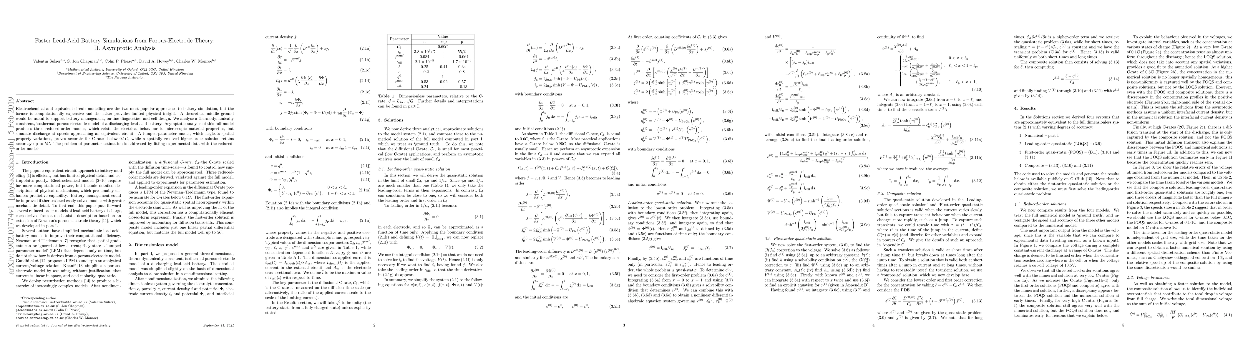 This paper develops reduced-order models from a porous-electrode theory for faster lead-acid battery simulations, offering a balance between computational efficiency and physical insight. The models accurately simulate discharge rates up to 5C, with a lumped-parameter model effective for lower rates.