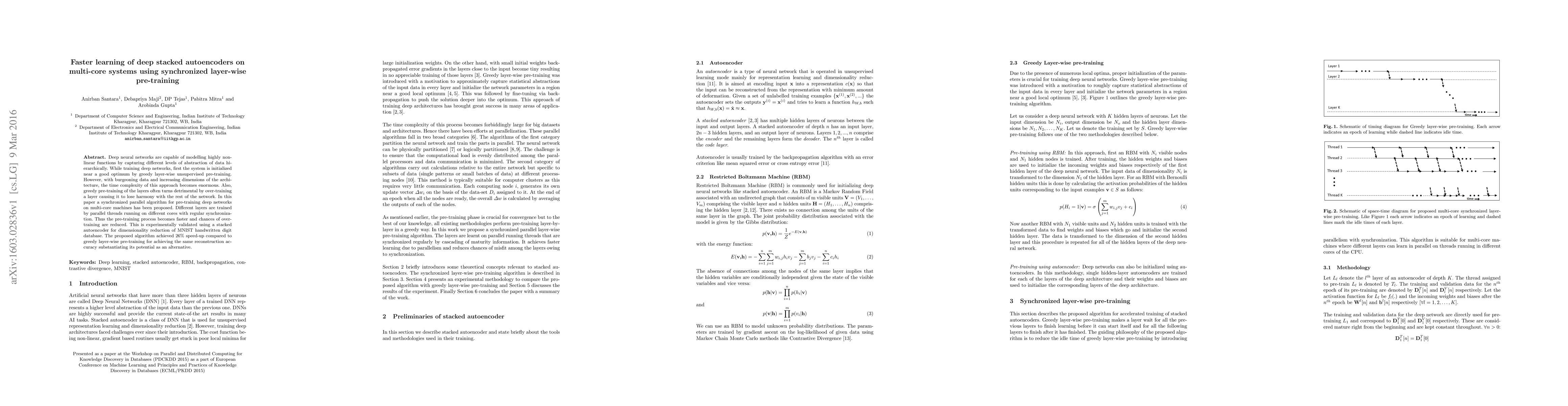 This paper proposes a synchronized parallel algorithm for faster training of deep stacked autoencoders on multi-core systems, achieving a 26% speed-up over traditional greedy layer-wise pre-training while reducing over-training risks. Experimental validation using a stacked autoencoder on the MNIST dataset demonstrates its effectiveness.