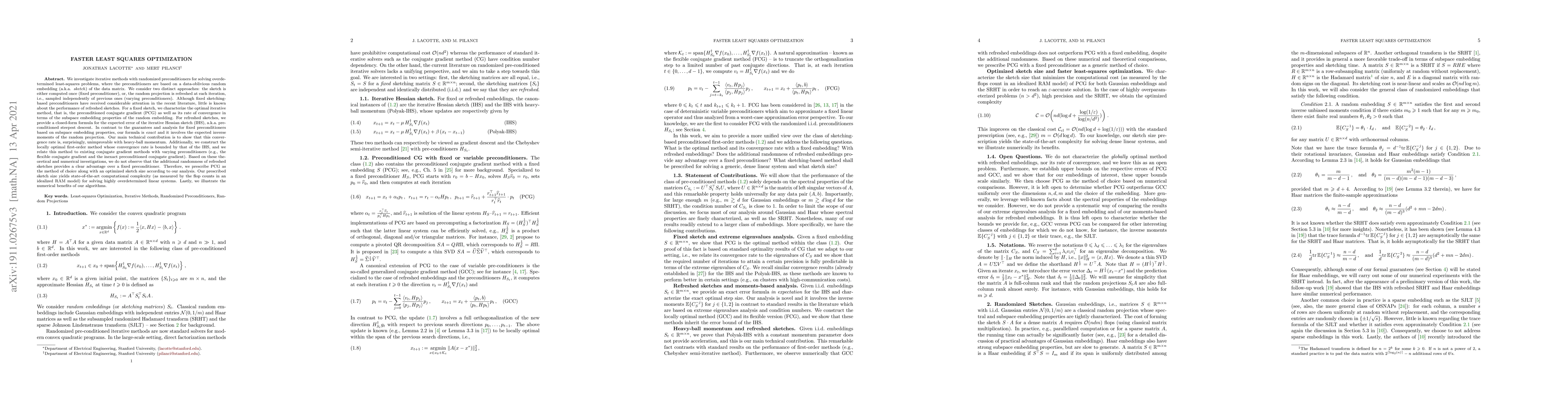 We investigate iterative methods with randomized preconditioners for solving overdetermined least-squares problems, where the preconditioners are based on a random embedding of the data matrix. We consider two distinct approaches: the sketch is either computed once (fixed preconditioner), or, the random projection is refreshed at each iteration, i.e., sampled independently of previous ones (varying preconditioners). Although fixed sketching-based preconditioners have received considerable attention in the recent literature, little is known about the performance of refreshed sketches. For a fixed sketch, we characterize the optimal iterative method, that is, the preconditioned conjugate gradient as well as its rate of convergence in terms of the subspace embedding properties of the random embedding. For refreshed sketches, we provide a closed-form formula for the expected error of the iterative Hessian sketch (IHS), a.k.a. preconditioned steepest descent. In contrast to the guarantees and analysis for fixed preconditioners based on subspace embedding properties, our formula is exact and it involves the expected inverse moments of the random projection. Our main technical contribution is to show that this convergence rate is, surprisingly, unimprovable with heavy-ball momentum. Additionally, we construct the locally optimal first-order method whose convergence rate is bounded by that of the IHS. Based on these theoretical and numerical investigations, we do not observe that the additional randomness of refreshed sketches provides a clear advantage over a fixed preconditioner. Therefore, we prescribe PCG as the method of choice along with an optimized sketch size according to our analysis. Our prescribed sketch size yields state-of-the-art computational complexity for solving highly overdetermined linear systems. Lastly, we illustrate the numerical benefits of our algorithms.