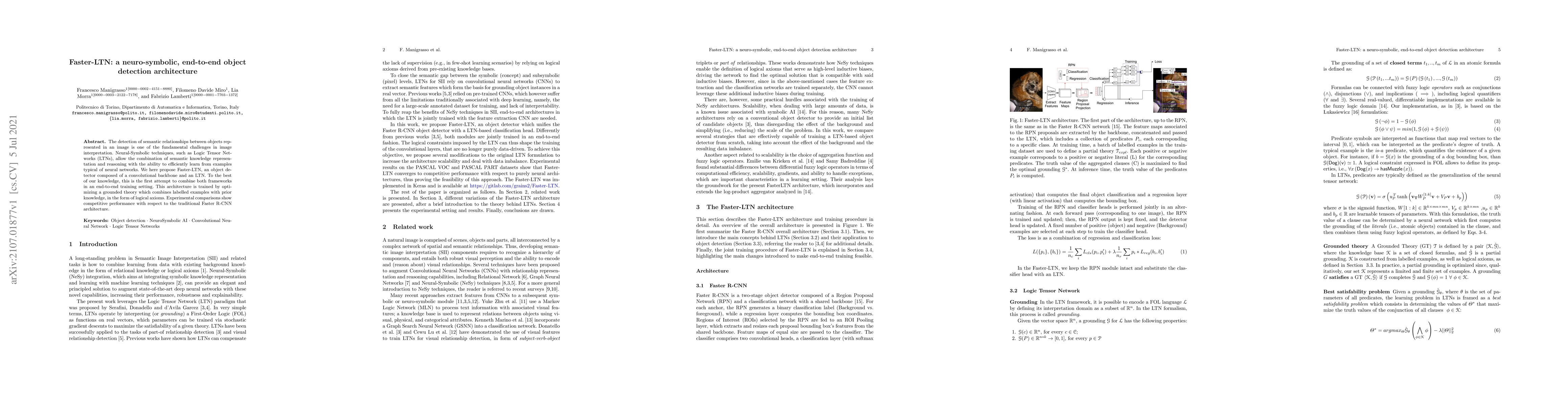 Faster-LTN integrates Logic Tensor Networks with convolutional neural networks for end-to-end object detection, combining semantic knowledge with neural learning. It demonstrates competitive performance against traditional Faster R-CNN by leveraging both labelled examples and logical axioms.