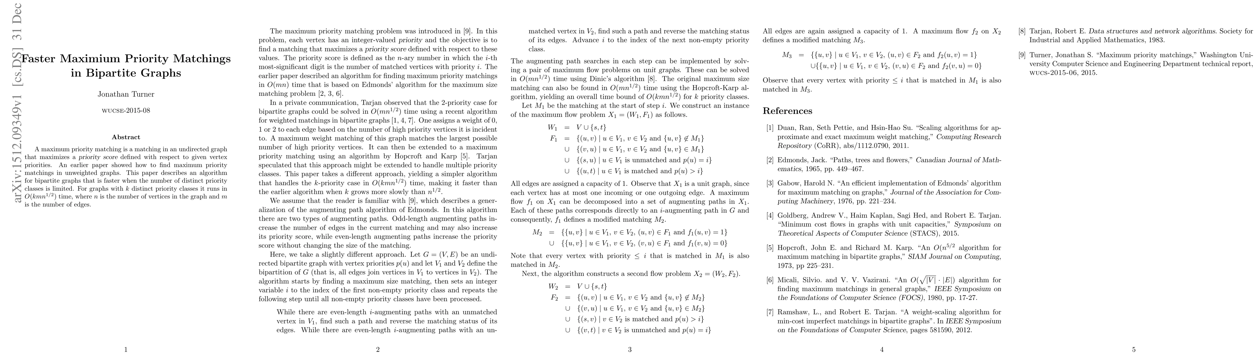 This paper presents a faster algorithm for finding maximum priority matchings in bipartite graphs when the number of distinct priority classes is limited, running in $O(kmn^{1/2})$ time, where $k$ is the number of distinct priority classes, $n$ is the number of vertices, and $m$ is the number of edges. This improves upon previous methods for such cases.