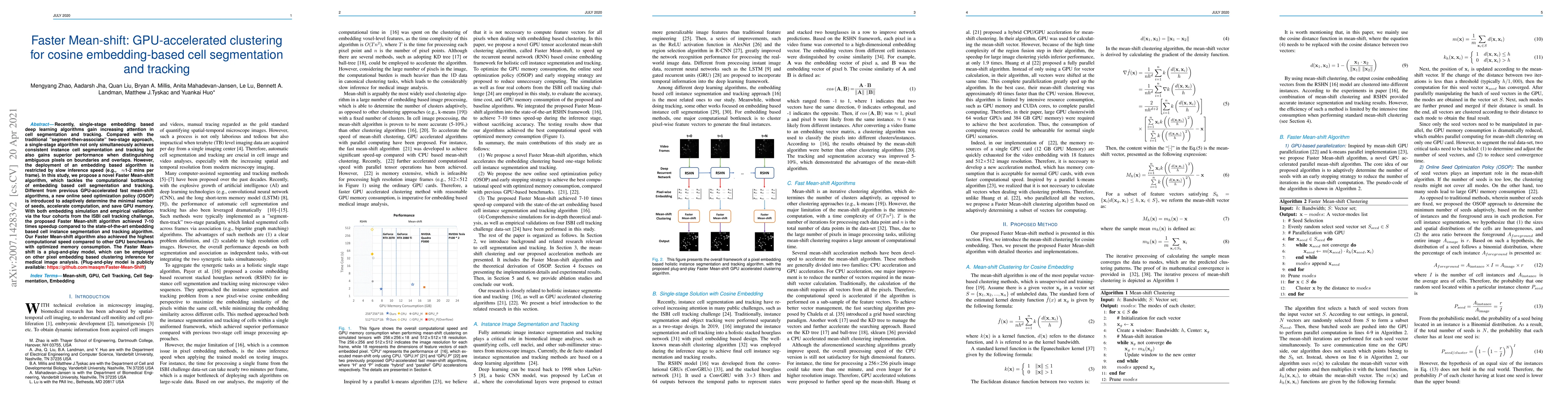 This paper proposes a Faster Mean-shift algorithm to accelerate GPU-based clustering for cell segmentation and tracking using cosine embedding. The new online seed optimization policy (OSOP) significantly speeds up computation and reduces memory usage, achieving 7-10 times faster performance compared to existing methods, while maintaining high accuracy.