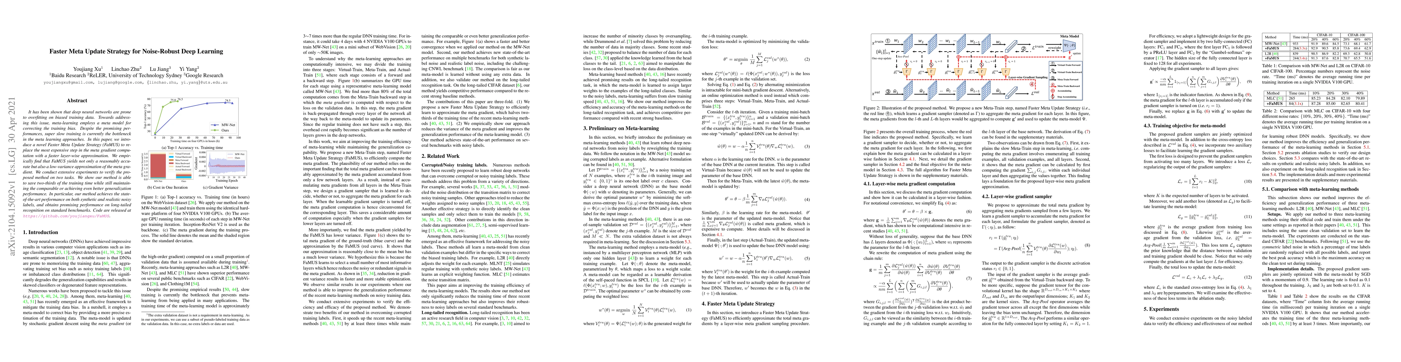 A new method called Faster Meta Update Strategy (FaMUS) speeds up meta-learning for deep neural networks while maintaining comparable performance on noisy data. It saves two-thirds of training time without sacrificing accuracy or generalization.
