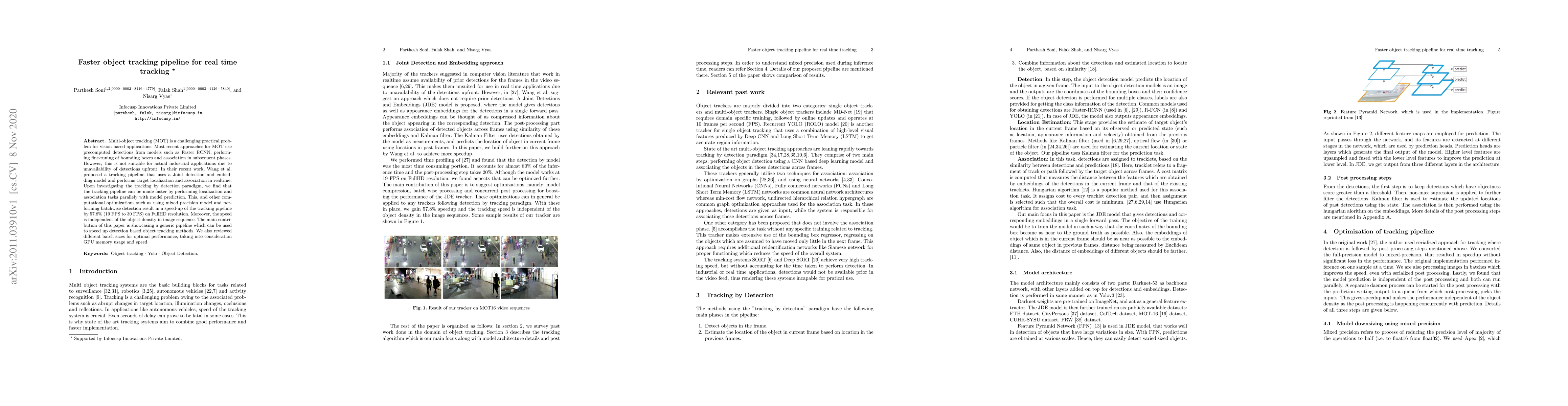 Multi-object tracking (MOT) is a challenging practical problem for vision based applications. Most recent approaches for MOT use precomputed detections from models such as Faster RCNN, performing fine-tuning of bounding boxes and association in subsequent phases. However, this is not suitable for actual industrial applications due to unavailability of detections upfront. In their recent work, Wang et al. proposed a tracking pipeline that uses a Joint detection and embedding model and performs target localization and association in realtime. Upon investigating the tracking by detection paradigm, we find that the tracking pipeline can be made faster by performing localization and association tasks parallely with model prediction. This, and other computational optimizations such as using mixed precision model and performing batchwise detection result in a speed-up of the tracking pipeline by 57.8\% (19 FPS to 30 FPS) on FullHD resolution. Moreover, the speed is independent of the object density in image sequence. The main contribution of this paper is showcasing a generic pipeline which can be used to speed up detection based object tracking methods. We also reviewed different batch sizes for optimal performance, taking into consideration GPU memory usage and speed.