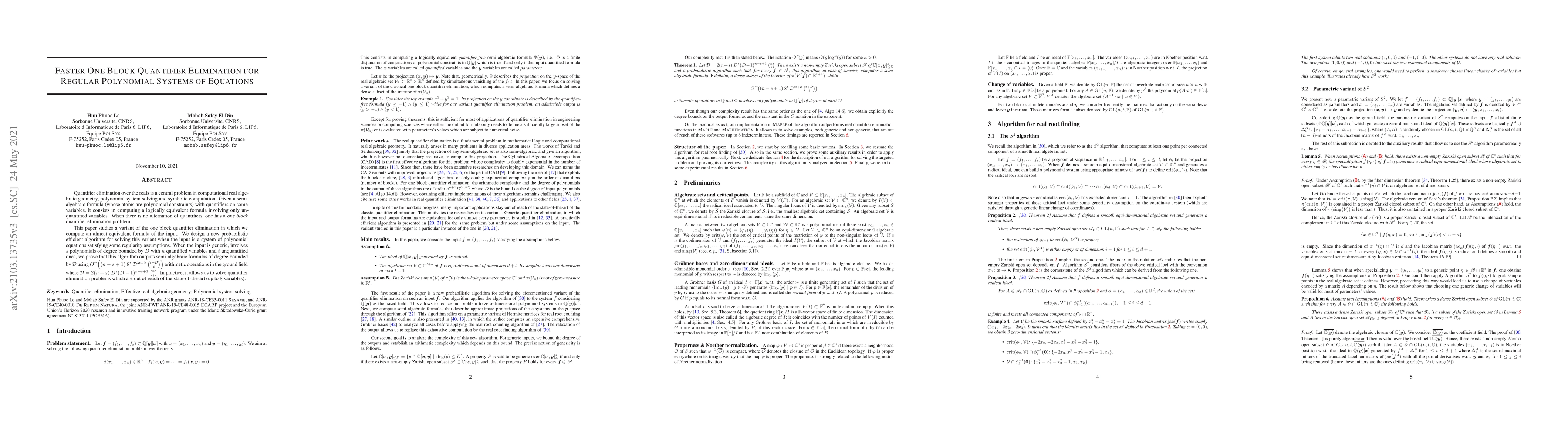 This paper presents a probabilistic algorithm for faster one block quantifier elimination in regular polynomial systems, achieving significant efficiency improvements. The algorithm outputs semi-algebraic formulas of bounded degree using a reduced number of arithmetic operations, enabling the solution of problems previously intractable for up to 8 variables.
