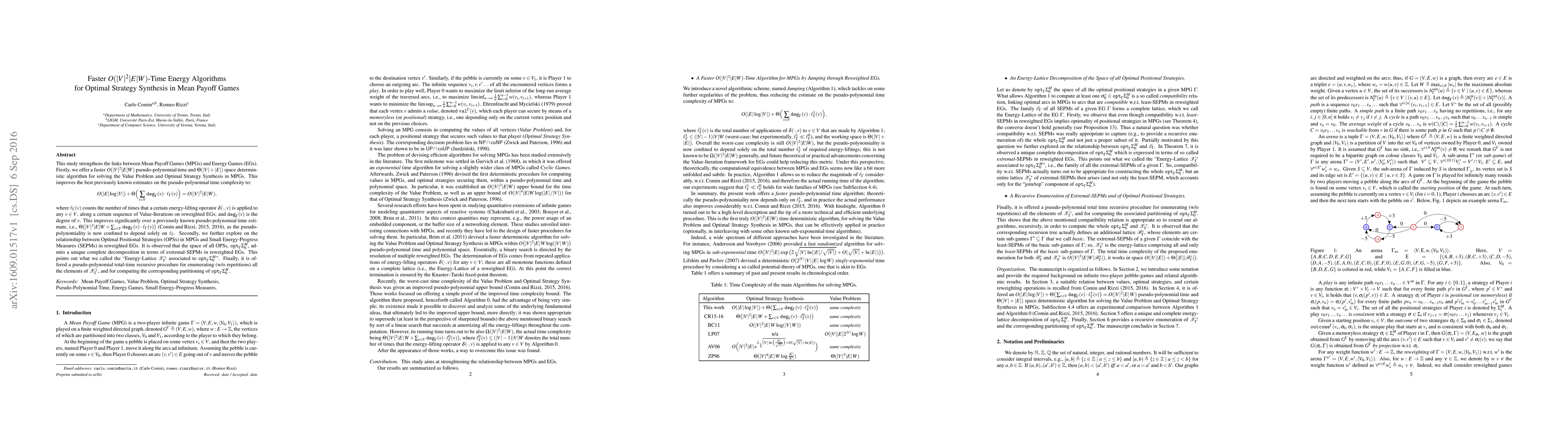 This study strengthens the links between Mean Payoff Games (\MPG{s}) and Energy Games (EG{s}). Firstly, we offer a faster $O(|V|^2|E|W)$ pseudo-polynomial time and $\Theta(|V|+|E|)$ space deterministic algorithm for solving the Value Problem and Optimal Strategy Synthesis in \MPG{s}. This improves the best previously known estimates on the pseudo-polynomial time complexity to: \[ O(|E|\log |V|) + \Theta\Big(\sum_{v\in V}\texttt{deg}_{\Gamma}(v)\cdot\ell_{\Gamma}(v)\Big) = O(|V|^2|E|W), \] where $\ell_{\Gamma}(v)$ counts the number of times that a certain energy-lifting operator $\delta(\cdot, v)$ is applied to any $v\in V$, along a certain sequence of Value-Iterations on reweighted \EG{s}; and $\texttt{deg}_{\Gamma}(v)$ is the degree of $v$. This improves significantly over a previously known pseudo-polynomial time estimate, i.e. $\Theta\big(|V|^2|E|W + \sum_{v\in V}\texttt{deg}_{\Gamma}(v)\cdot\ell_{\Gamma}(v)\big)$ \citep{CR15, CR16}, as the pseudo-polynomiality is now confined to depend solely on $\ell_\Gamma$. Secondly, we further explore on the relationship between Optimal Positional Strategies (OPSs) in \MPG{s} and Small Energy-Progress Measures (SEPMs) in reweighted \EG{s}. It is observed that the space of all OPSs, $\texttt{opt}_{\Gamma}\Sigma^M_0$, admits a unique complete decomposition in terms of extremal-SEPM{s} in reweighted EG{s}. This points out what we called the "Energy-Lattice $\mathcal{X}^*_{\Gamma}$ associated to $\texttt{opt}_{\Gamma}\Sigma^M_0$". Finally, it is offered a pseudo-polynomial total-time recursive procedure for enumerating (w/o repetitions) all the elements of $\mathcal{X}^*_{\Gamma}$, and for computing the corresponding partitioning of $\texttt{opt}_{\Gamma}\Sigma^M_0$.