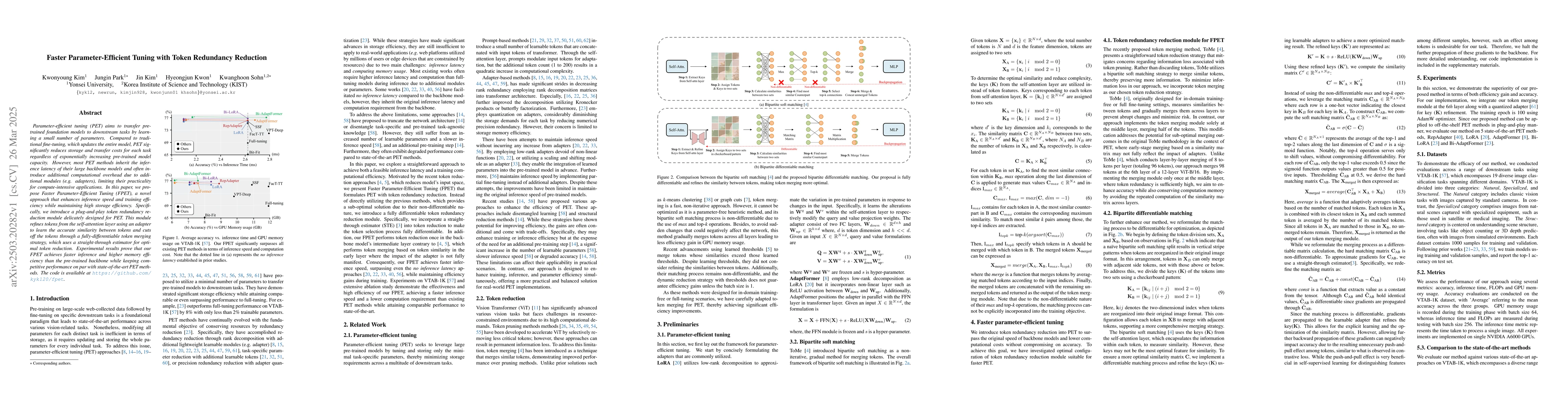 The paper proposes Faster Parameter-Efficient Tuning (FPET), which introduces a token redundancy reduction module using an adapter for accurate token similarity learning and a differentiable token merging strategy with straight-through estimator for optimal token reduction.