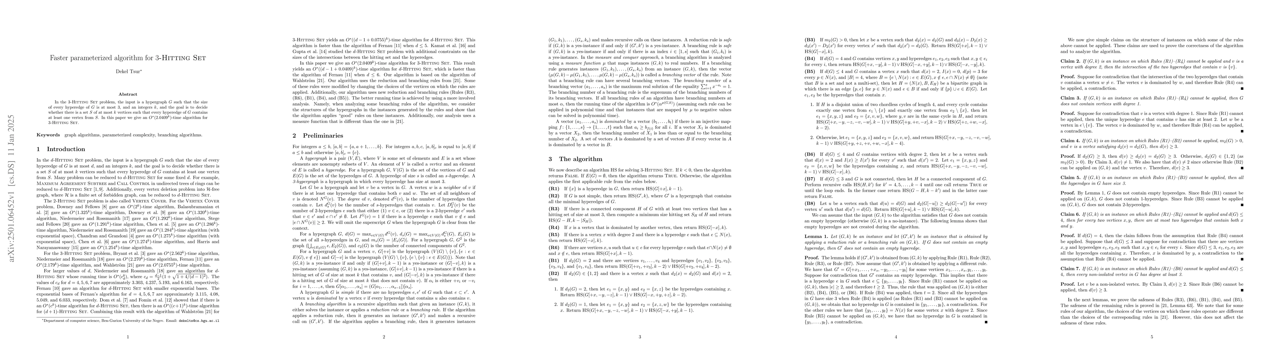 The paper presents a parameterized algorithm for the 3-Hitting Set problem, utilizing a branching strategy with specific reduction rules.