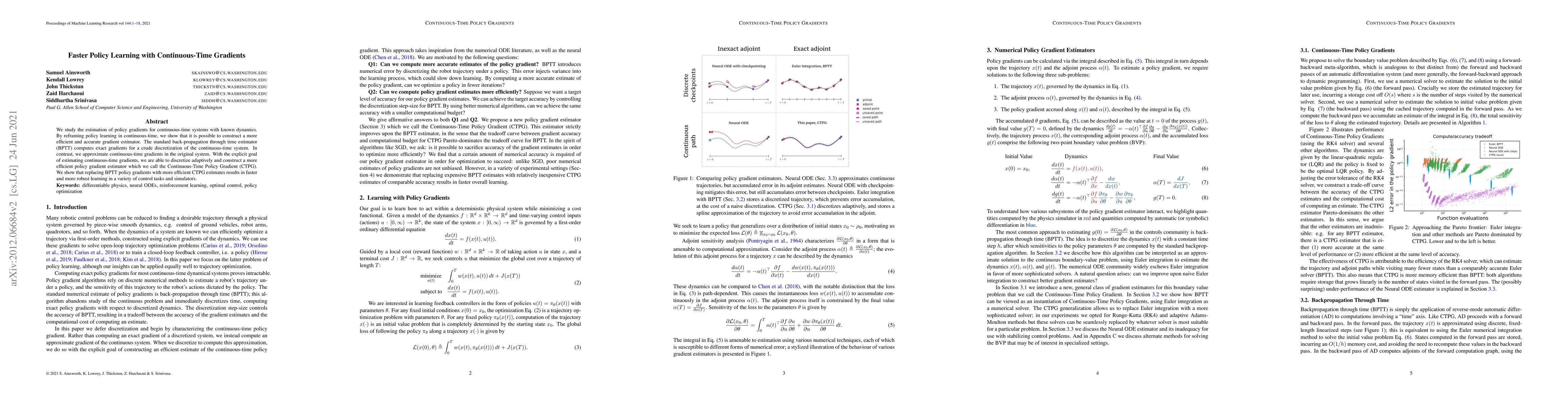This paper proposes a Continuous-Time Policy Gradient (CTPG) estimator to improve policy learning efficiency in continuous-time systems. Unlike the standard back-propagation through time estimator, CTPG approximates continuous-time gradients directly, leading to faster and more robust learning in various control tasks.