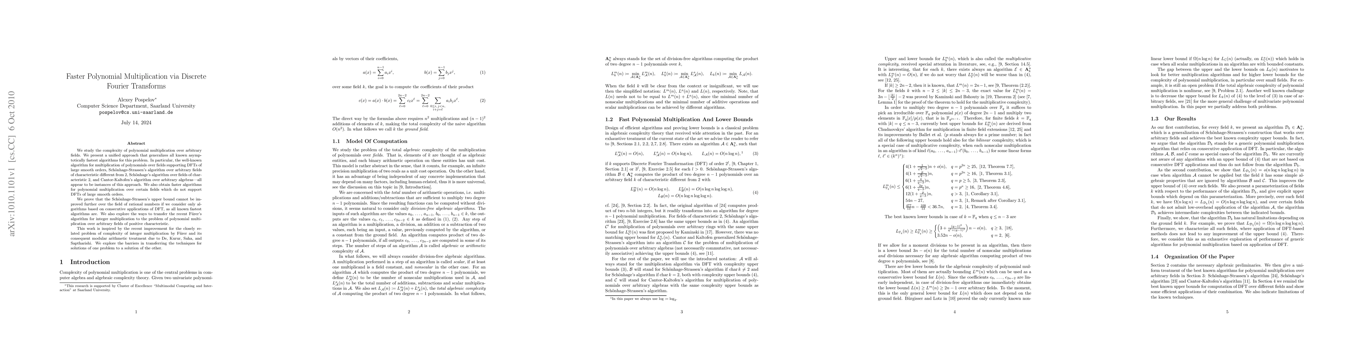 We study the complexity of polynomial multiplication over arbitrary fields. We present a unified approach that generalizes all known asymptotically fastest algorithms for this problem. In particular, the well-known algorithm for multiplication of polynomials over fields supporting DFTs of large smooth orders, Sch\"onhage-Strassen's algorithm over arbitrary fields of characteristic different from 2, Sch\"onhage's algorithm over fields of characteristic 2, and Cantor-Kaltofen's algorithm over arbitrary algebras---all appear to be instances of this approach. We also obtain faster algorithms for polynomial multiplication over certain fields which do not support DFTs of large smooth orders. We prove that the Sch\"onhage-Strassen's upper bound cannot be improved further over the field of rational numbers if we consider only algorithms based on consecutive applications of DFT, as all known fastest algorithms are. We also explore the ways to transfer the recent F\"urer's algorithm for integer multiplication to the problem of polynomial multiplication over arbitrary fields of positive characteristic. This work is inspired by the recent improvement for the closely related problem of complexity of integer multiplication by F\"urer and its consequent modular arithmetic treatment due to De, Kurur, Saha, and Saptharishi. We explore the barriers in transferring the techniques for solutions of one problem to a solution of the other.